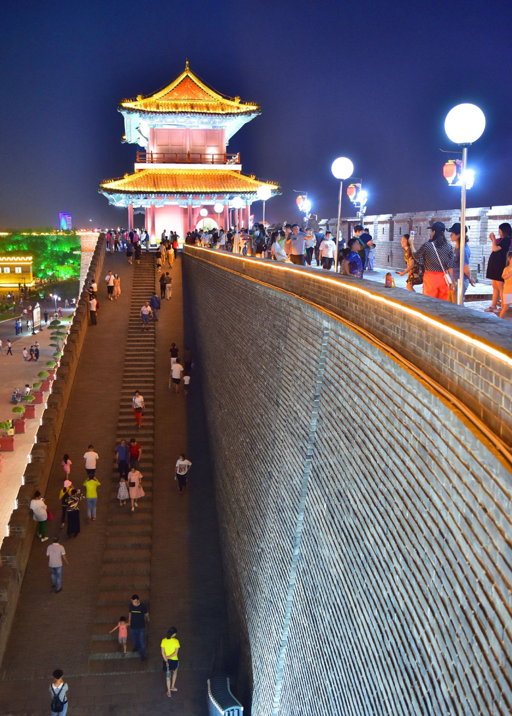 河北正定古城南城门在霓虹灯的映衬下魅力尽显,人们在夜色下欣赏古城风貌。图片来源:新华社