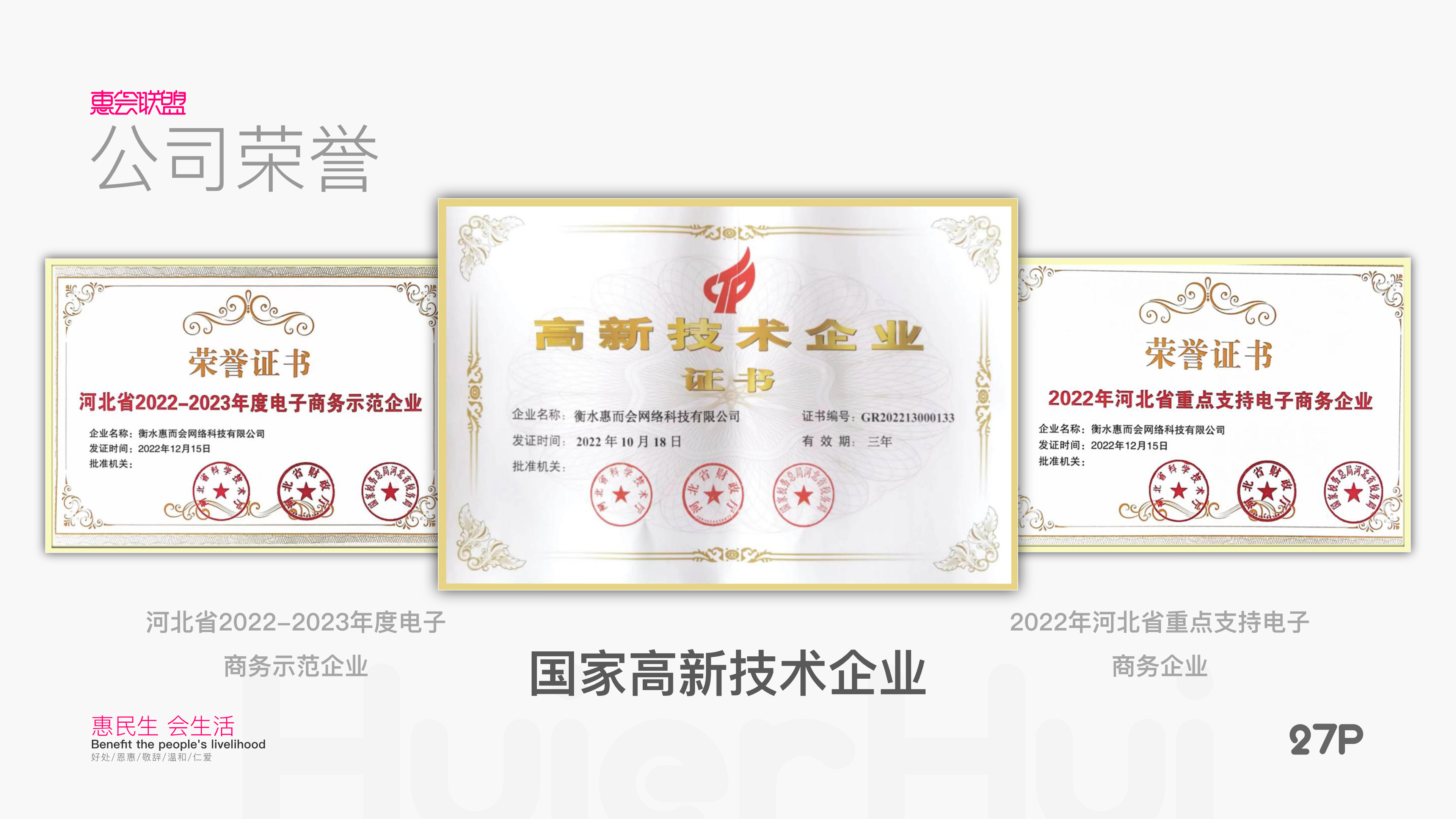四年多的艰苦创业,公司拥有了几十项技术专利,其中13项获国家级奖项。“惠会联盟APP数字平台”获中国互联网+新零售消费最佳商业模式创新奖、中国互联网+新零售领导品牌、中国云数据计算机应用十大共享经济平台等荣誉,公司被评为河北省“互联网+”创新发展优胜企业、河北省科技型中小企业。