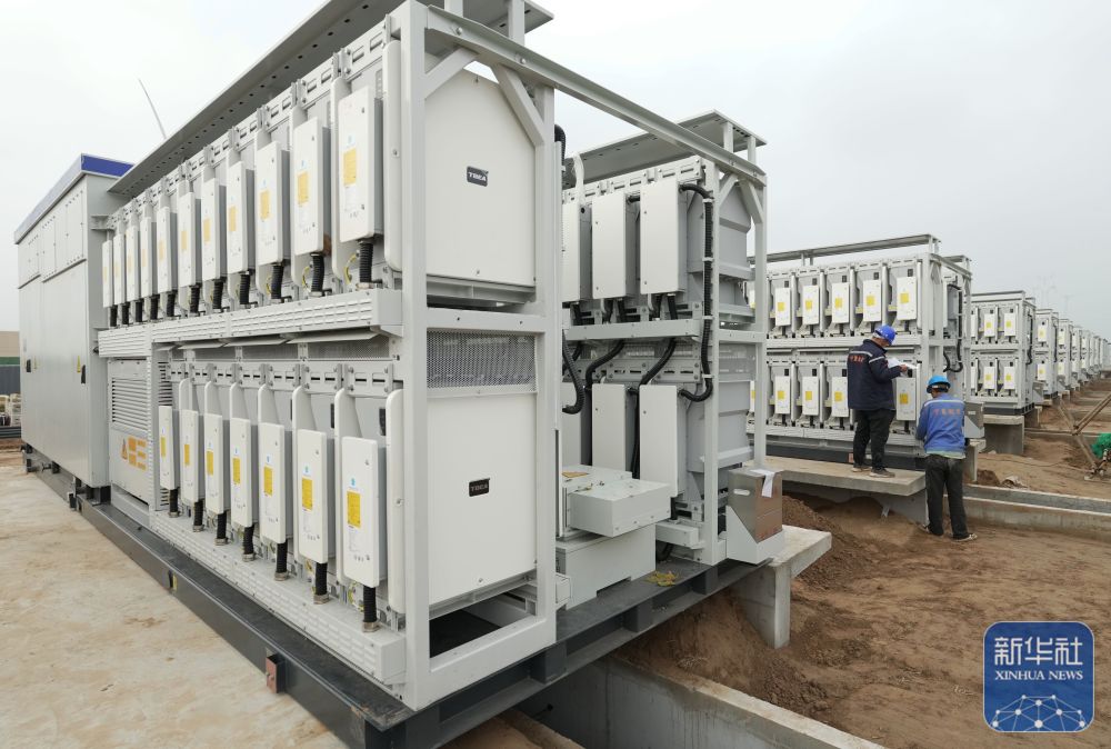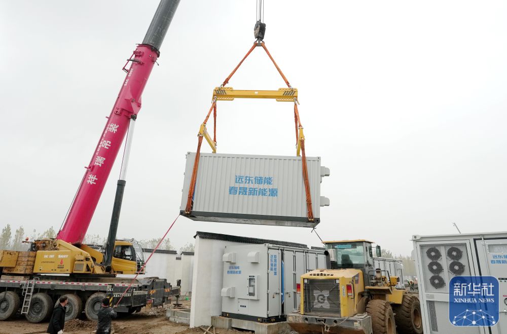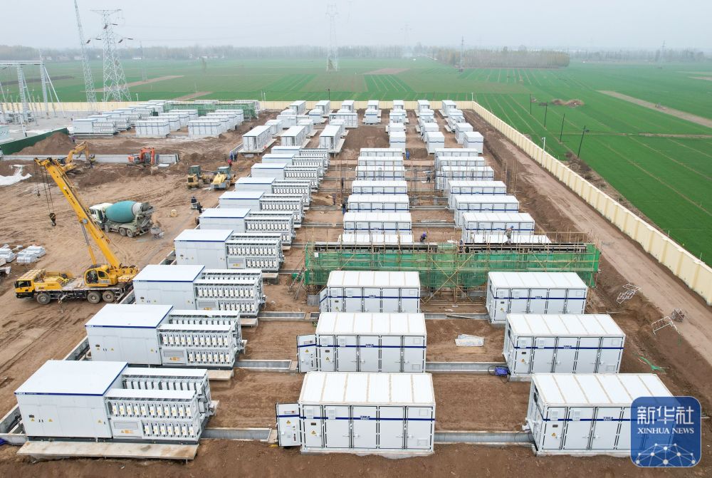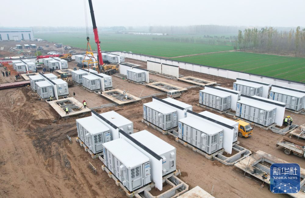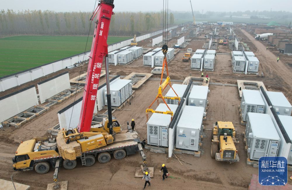 ↑11月15日,工人在位于河北省衡水市武邑县武邑镇境内的百兆瓦级独立储能电站建设工地施工。