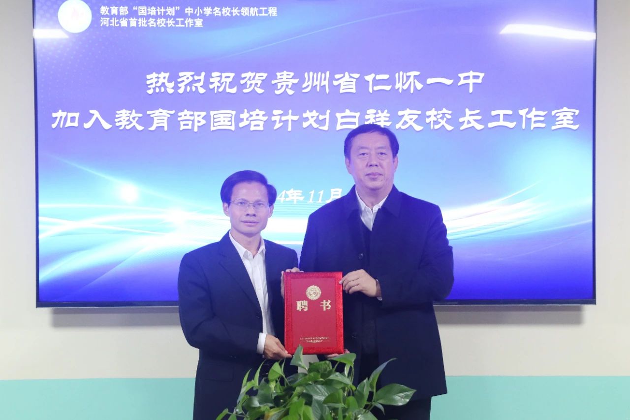 “白祥友校长工作室”主持人、衡水市教育局督学、衡水十三中党委书记白祥友(右)向贵州省仁怀市第一中学校长罗正刚颁发聘书。