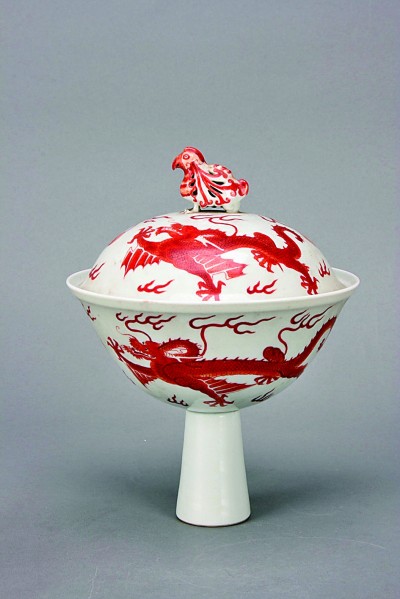 清代乾隆白地红龙天鸡钮高足盖碗。承德博物馆供图