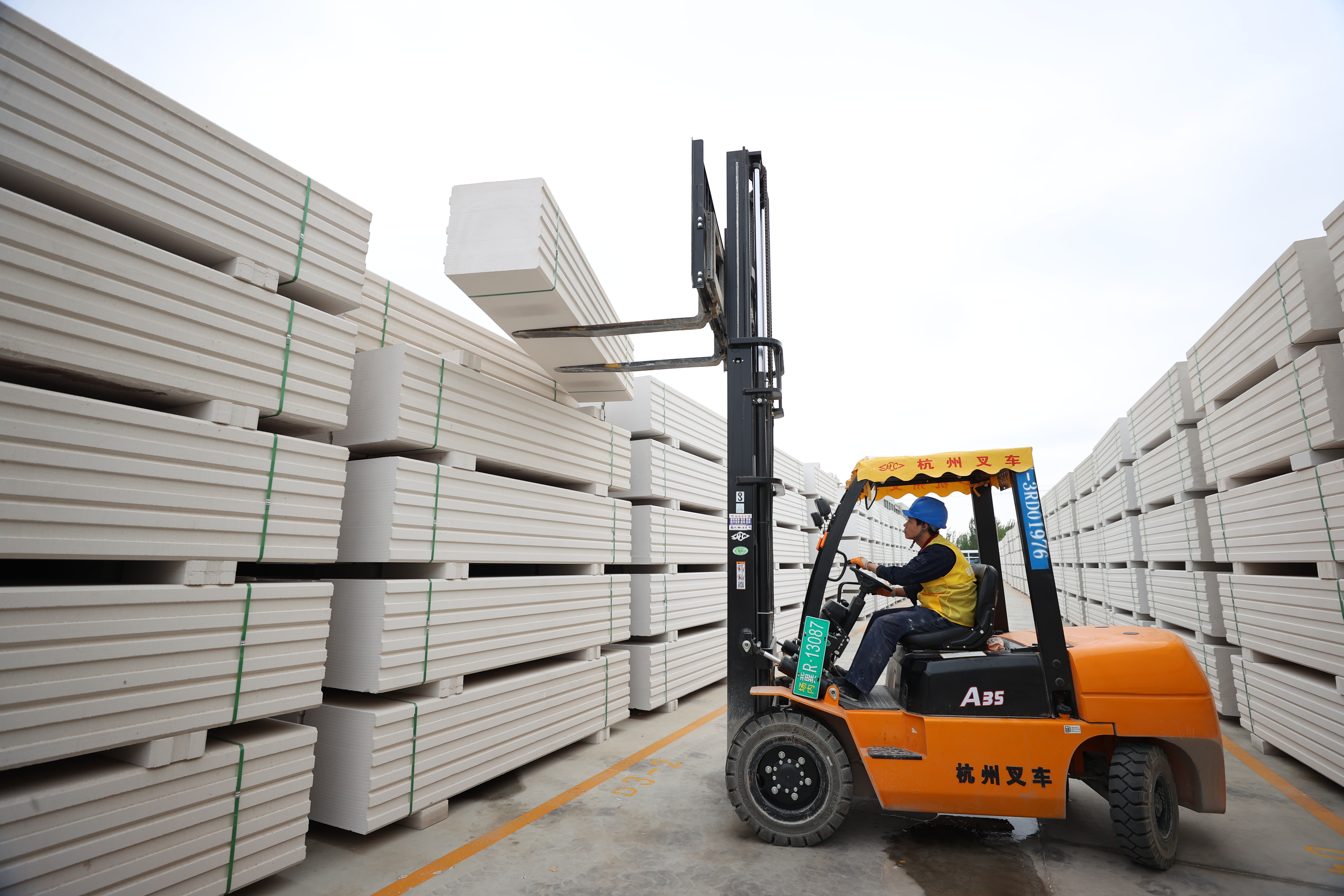 图为文安县玖顺建材有限公司产品码放区,工人正在码放成品。