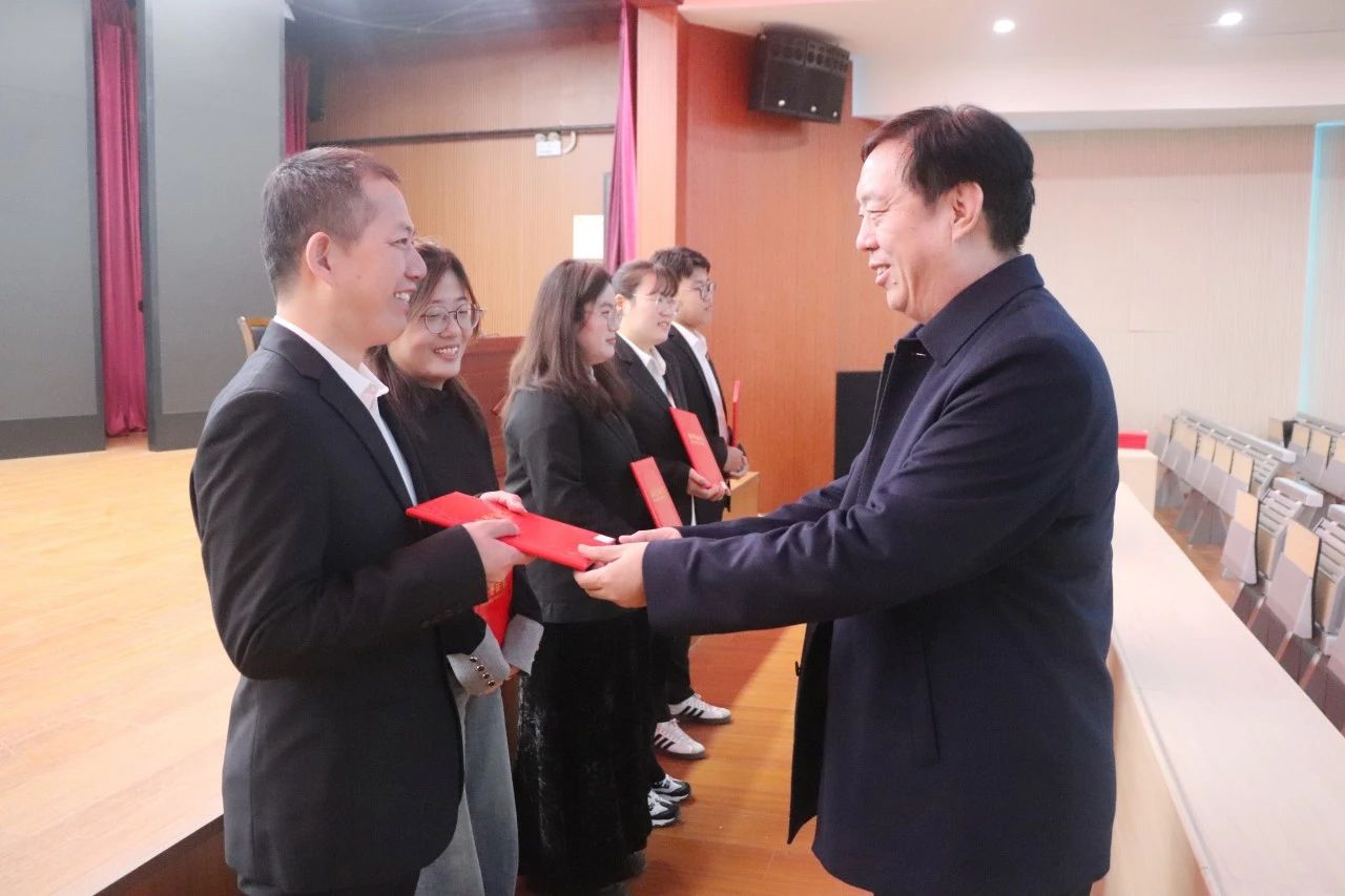 市教育局督学、衡水十三中党委书记白祥友(右)为在大公开课大教研活动中表现优异的教师颁奖。