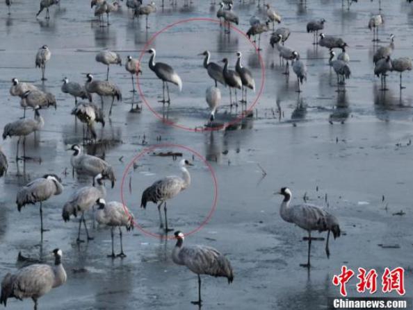 据河北衡水湖国家级自然保护区消息,工作人员近日在进行冬季鸟类监测时,接到影友提供的影像资料——三种鹤在湖区冰面上罕见同框,分别是4只国家一级保护动物白枕鹤和1只同级别的白头鹤,在国家二级保护动物灰鹤群中时而低头觅食,时而振翅欲飞。白枕鹤、白头鹤分别与灰鹤等其它鹤类混居的情况此前曾有发现,但这次是在衡水湖首次记录这三种鹤类同框。衡水湖位于河北省衡水市,是“东亚—澳大利西亚候鸟迁徙线”上的重要驿站,享有“京津冀最美湿地”等美誉。图为12月16日,在河北衡水湖拍摄到白枕鹤(上部红圈中)和白头鹤(下部红圈中)与灰鹤群一同活动的场景。