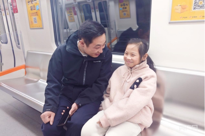 工作之余,王安永带孩子乘坐地铁感受郑州变化(央广网记者 夏莎 摄)