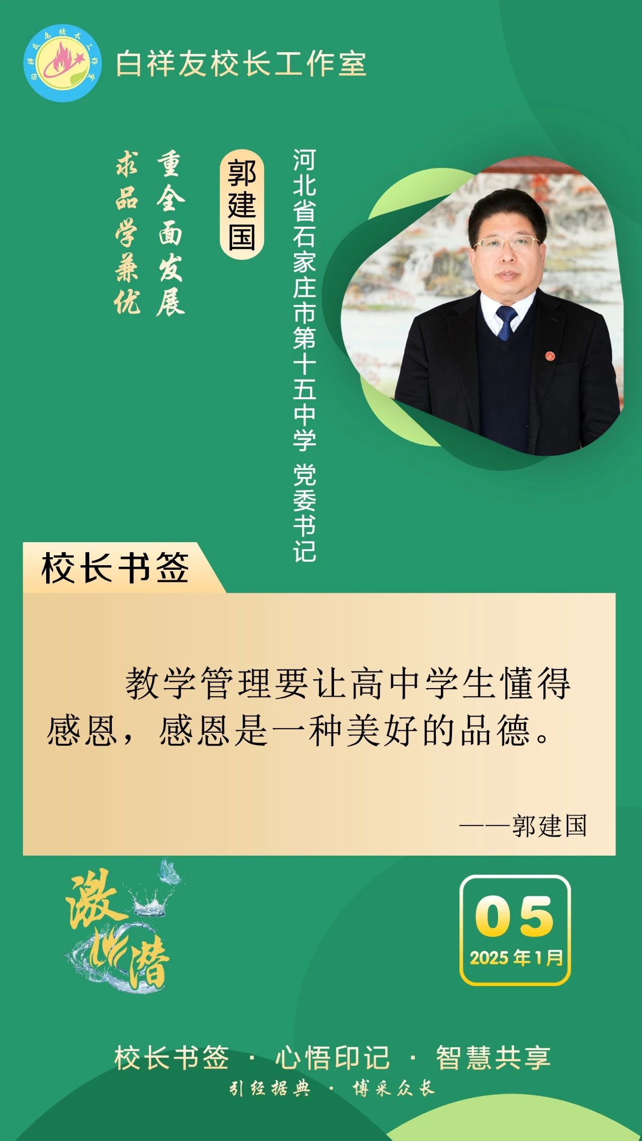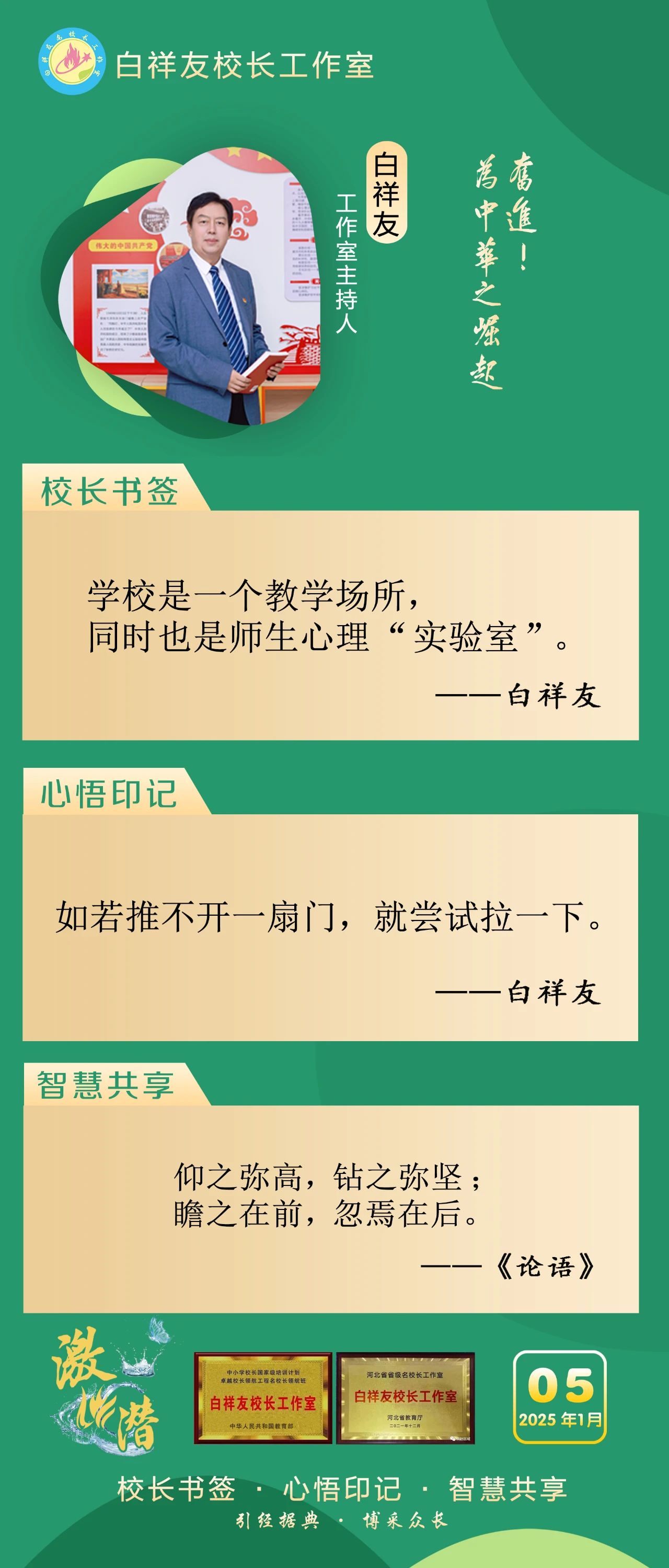 “白祥友校长工作室”成立于2019年4月,是教育部“国培计划”中小学名校长领航工程、河北省首批名校长工作室,目前省内外成员校48个。工作室坚持“资源共享、智慧共融、互助共赢”理念,已成为思想碰撞的交流场,资源共享的品牌站,成果展示的辐射源。