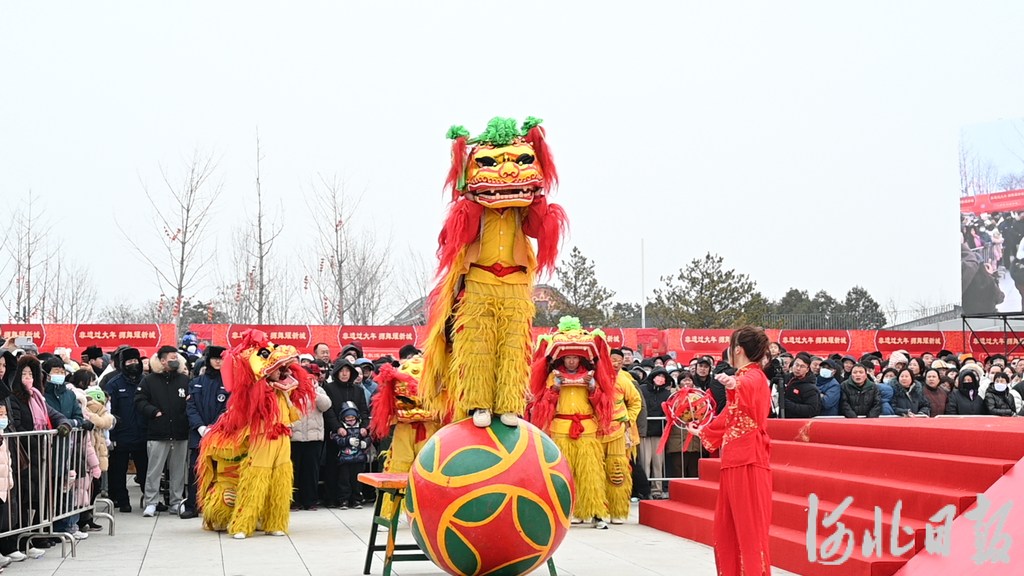 1月31日,“春节·雄安狮舞大会”精彩启幕。图为雄安洪亮龙狮队正在表演《金珠闹春》。河北日报记者 郝金钰摄