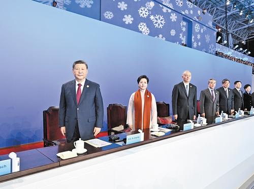 19时58分,在《和平——命运共同体》的乐曲声中,习近平和夫人彭丽媛,同国际奥委会主席巴赫、亚奥理事会第一副主席霍震霆等步入主席台,向观众挥手致意。全场响起长时间的热烈掌声。
