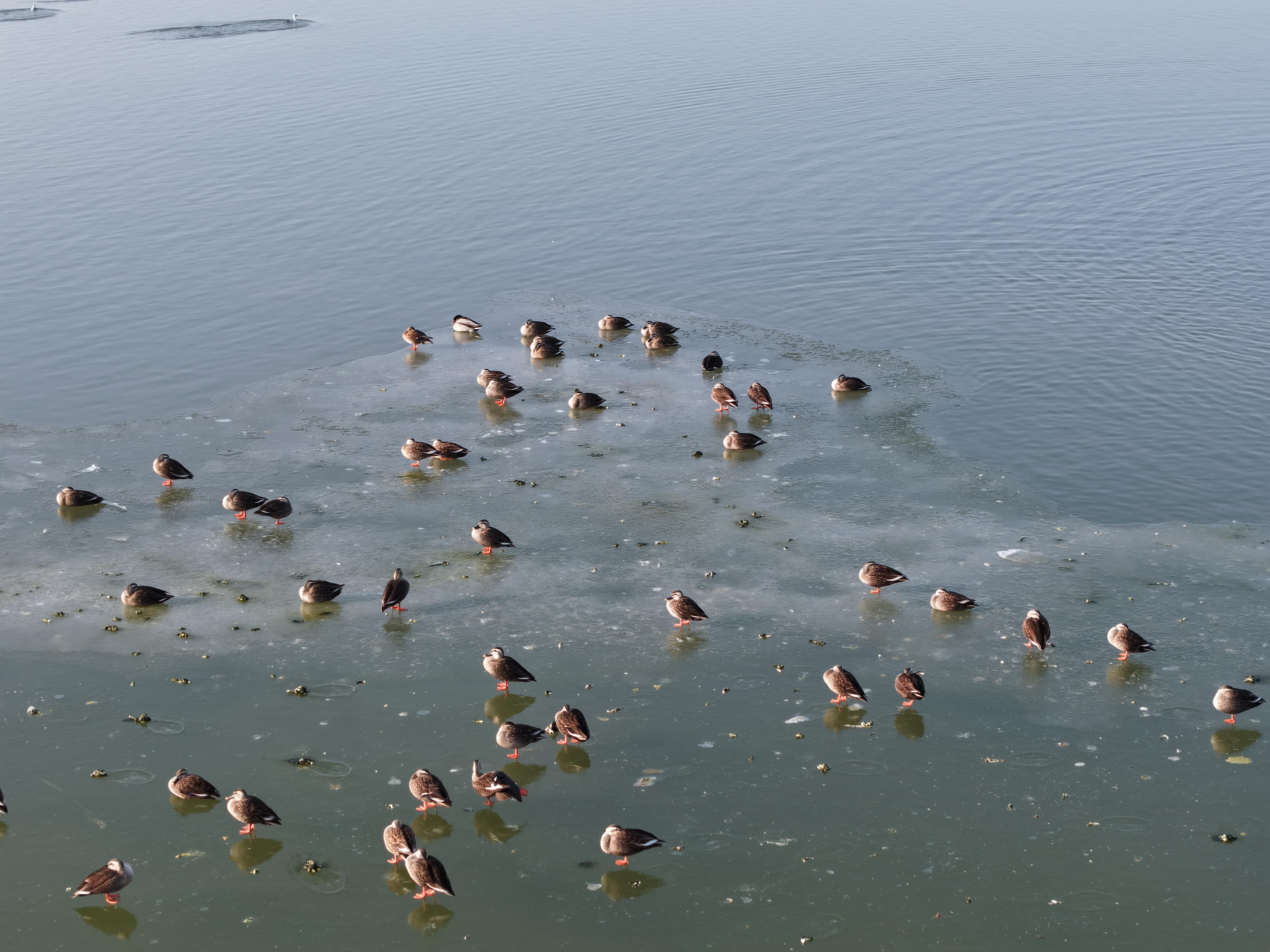 不远处,几只斑嘴鸭正惬意地休憩着。它们将头埋在翅膀之下,身体微微蜷缩,就像一个个毛茸茸的圆球。斑嘴鸭的嘴巴前端有着标志性的黄斑,这独特的标识让它们在鸭类中别具一格。它们在冰面上静静地享受着这片刻的宁静,对周围的一切都显得那么泰然自若,仿佛整个世界都与它们无关,只有这温暖的阳光和舒适的冰面才是它们此刻的全部。