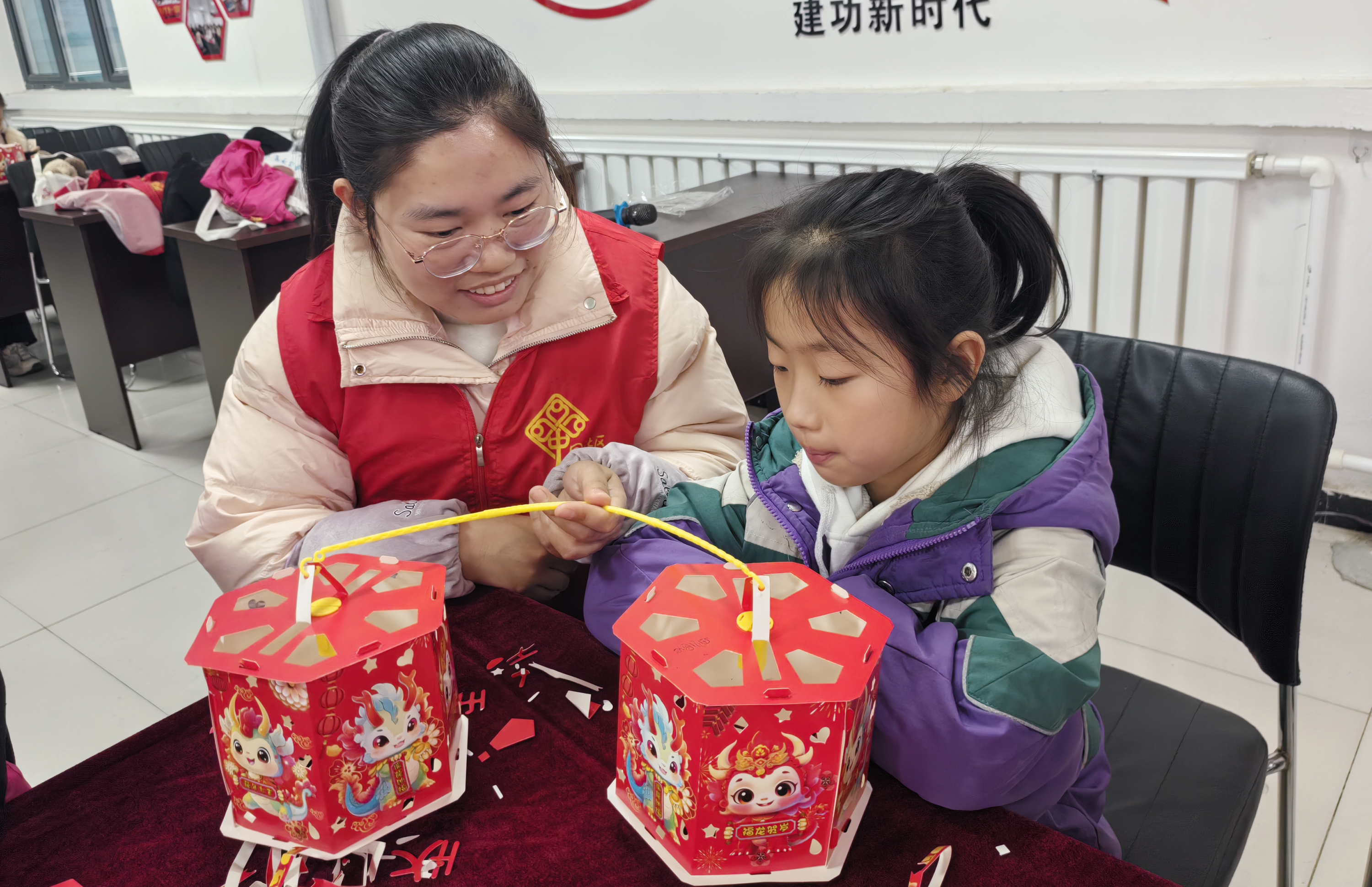 现场,一群活泼可爱的孩子们便迫不及待地在武罗社区工作者的悉心指导下,投入花灯制作之中。桌上摆放着各式各样的制作材料,彩纸、剪刀、胶水等一应俱全。孩子们眼中闪烁着兴奋与好奇的光芒,纷纷拿起材料,开始构思属于自己的花灯。在剪、粘、折的过程中,孩子们全神贯注,小手灵活地穿梭在各种材料之间。不一会儿,形态各异、色彩斑斓的花灯便在孩子们的巧手下诞生了。