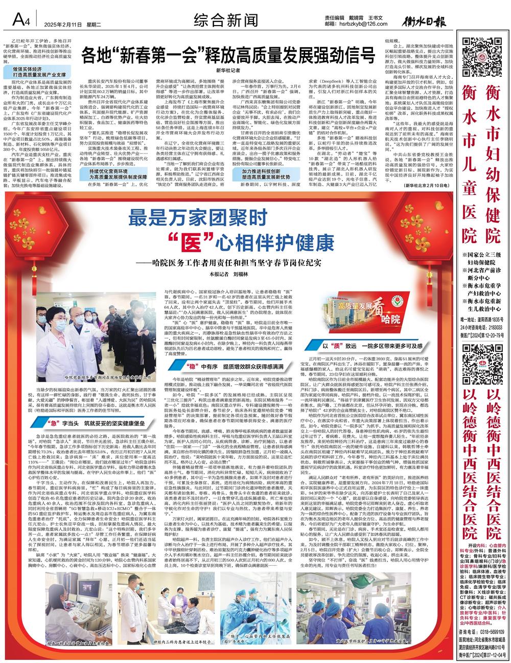 当除夕的祝福渲染出新春的气氛,当万家的灯火汇聚出团圆的喜悦,有这样一群忙碌的身影,践行着“敬畏生命、救死扶伤、甘于奉献、大爱无疆”的铮铮誓言,彰显着“人道博爱、大医为民”的哈院风采,葆有着高质量发展持续向上突围的奋斗姿态,这就是衡水市人民医院(哈励逊国际和平医院)医务工作者的佳节写照。