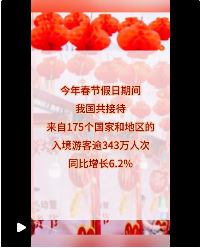 首个“非遗版”春节,普天同庆,五洲同春。“来华体验中国年”,是其中一道动人的风景。中国的高铁上、景区里,时常可见外国游客的身影。数据显示,今年春节假日期间,我国共接待来自175个国家和地区的入境游客逾343万人次,同比增长6.2%。