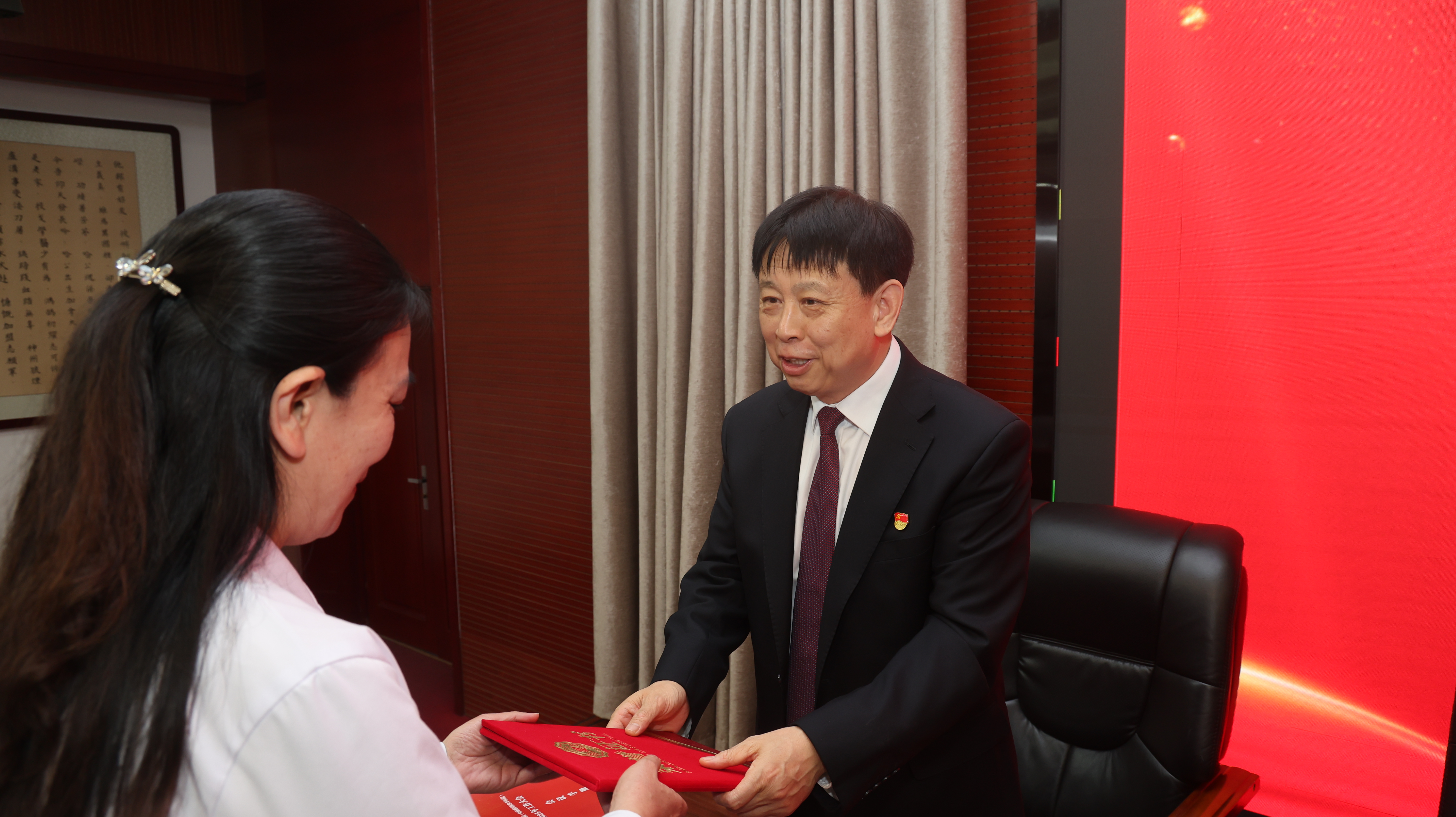 衡水市卫生健康委党组书记、主任高卫红,为哈院“博士团”重要成员、神经内三科负责人韩敬哲颁发全院“优秀科技工作者”奖金。