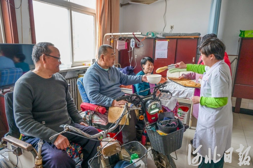3月1日,在唐山市截瘫疗养院,工作人员将做好的饭菜送到疗养员手里。 河北日报记者赵杰摄