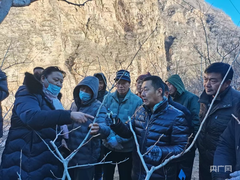 杨春鹏(右三)在田间教农民剪枝(央广网发 受访者供图)