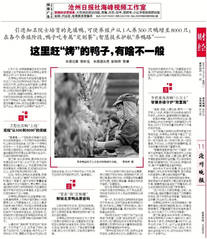 近年来,随着科技赋能,育种技术的不断升级和饲料配方的改良,乐寿鸭业已形成了肉鸭全产业链,烤鸭坯产销量占全国总销量的10%,成为全国最大的烤鸭坯生产企业,是当地产业发展的“金名片”。