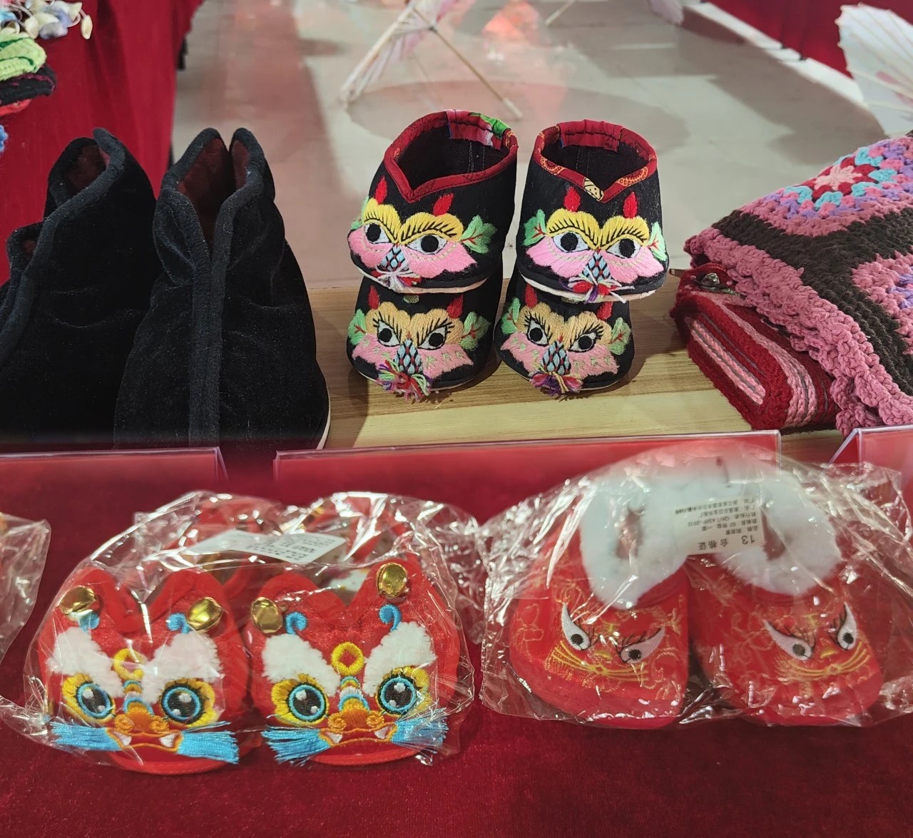 展览中,非遗剪纸、布雕画、琉璃簪花等手工艺品精美绝伦,让人爱不释手。知名画家刘竹铭的书法和篆刻作品,具有较高的艺术价值和收藏价值;民俗画家刘现辉的作品生动勾勒出衡水本地的生活万象和文化脉络;乡村女性绘画作品则展示了现代女性的独特魅力。除此之外,特色手工制作京剧布兜、栩栩如生的传统布艺老虎鞋、细致精巧的芦苇画、精巧别致的盘扣工艺画、创意新颖的毛线毡绣作品,还有鱼灯、布鞋、刺绣鞋垫等精美手工艺品,琳琅满目,令人目不暇接。室外的农产品交易摊位上整齐地摆放着蔬菜、面条、酱醋以及武邑县的特色电商产品,也吸引了不少村民前来选购。