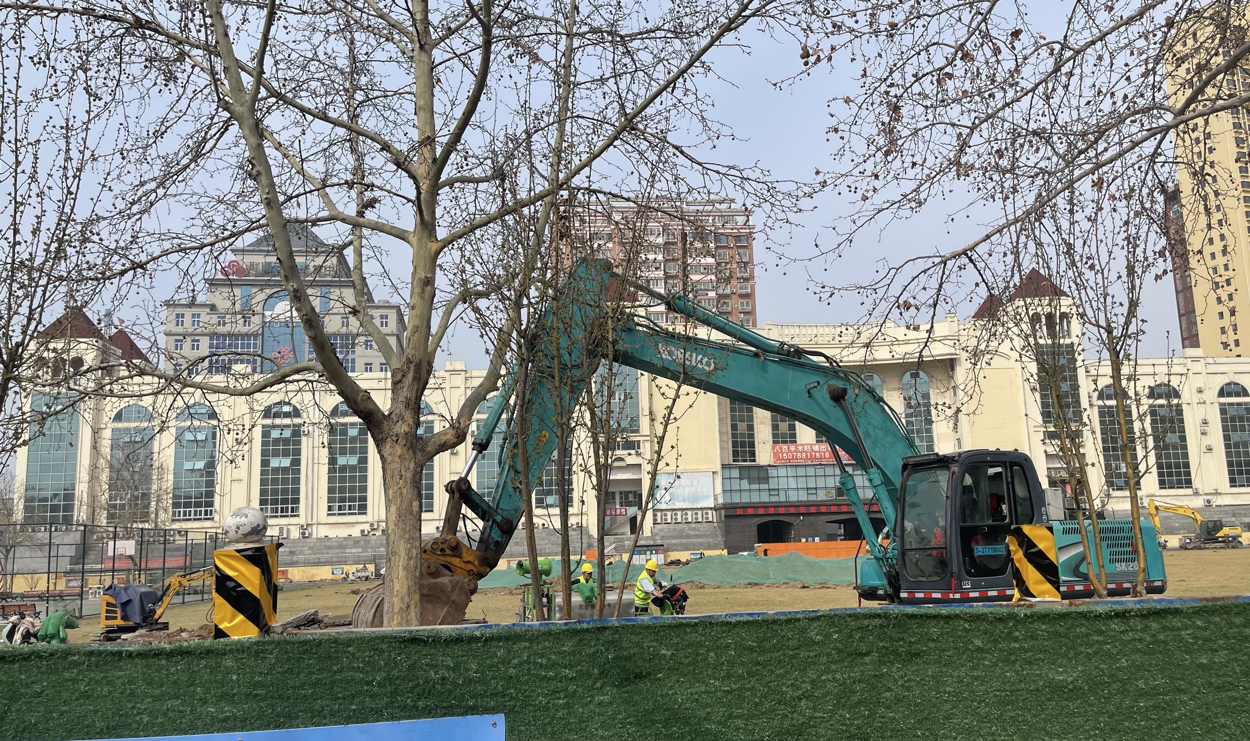 3月13日,记者来到市区体育休闲广场海绵化改造施工现场发现,广场四周架起了密实的施工围挡。穿过围挡施工大门,记者看到,广场部分地面表层已经被掀开,几台挖掘机正在轰鸣中挥舞铁臂,挖开地面表层花岗岩和土石,一旁的施工人员正忙着清理渣土,平整地面,铺设苫盖绿网。