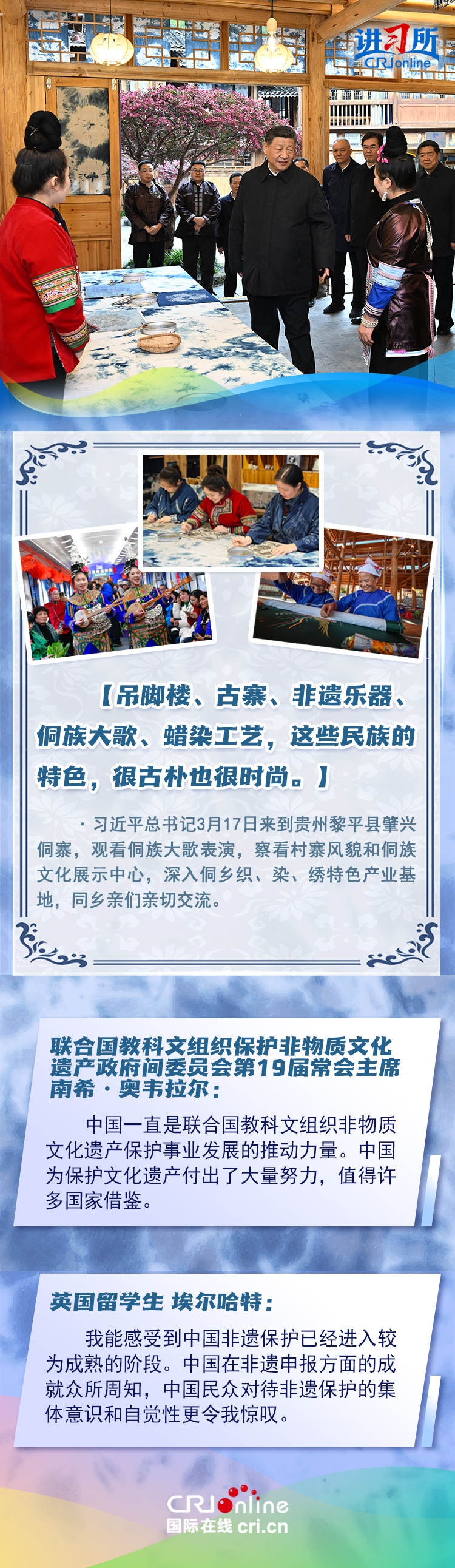 习近平总书记近日赴贵州、云南考察。他走进民族特色村寨、历史文化古城,心系历史文化遗产保护和文旅融合发展。习近平特别叮嘱当地官员和群众,既要保护有形的村落、民居、特色建筑风貌,传承无形的非物质文化遗产,又要推动其创造性转化、创新性发展。