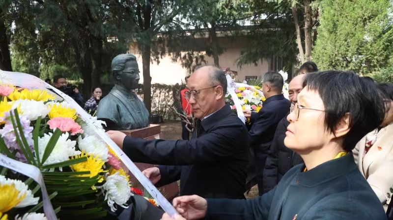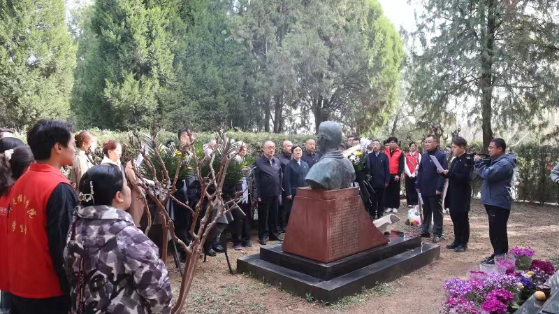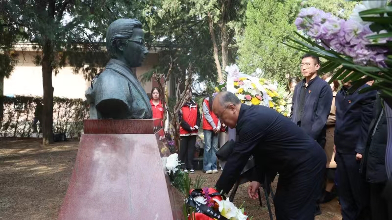 祭奠仪式现场庄严肃穆,四家单位代表共同为朱琏敬献花篮,寄托无限敬意与哀思。墓碑前各单位领导整理花篮挽联,全体祭扫者肃立,共同缅怀朱琏。绸带洁白,与苍翠松柏相映生辉;祭文铿锵,诉说先生坚韧执着崇尚科学的赤诚。