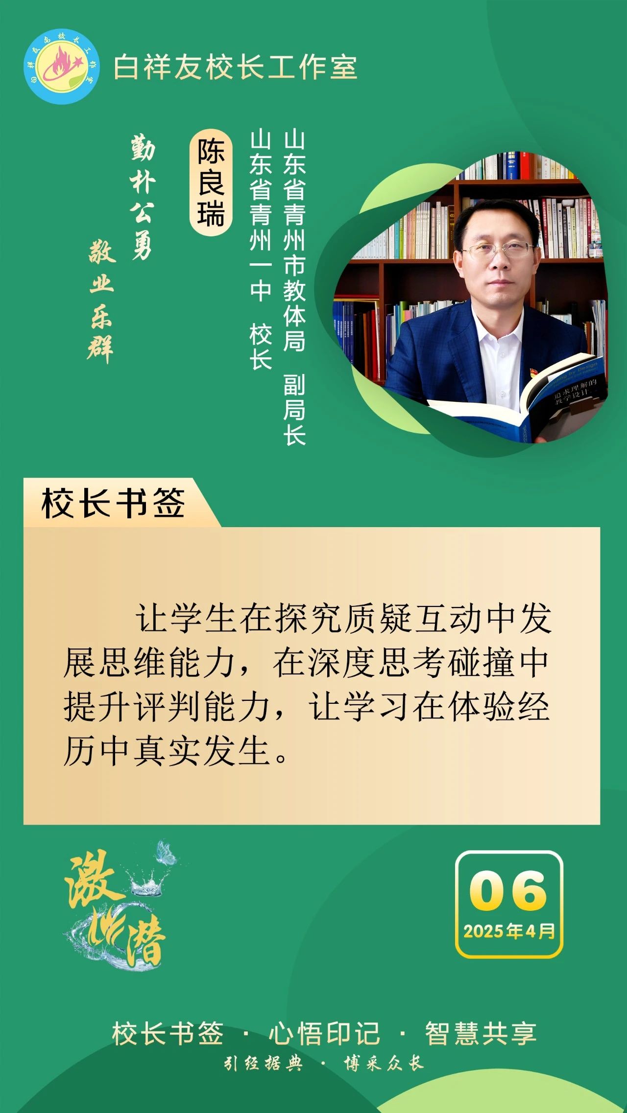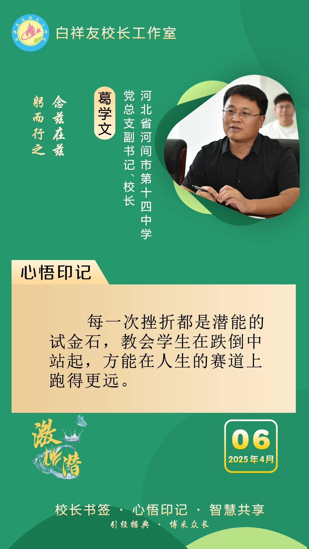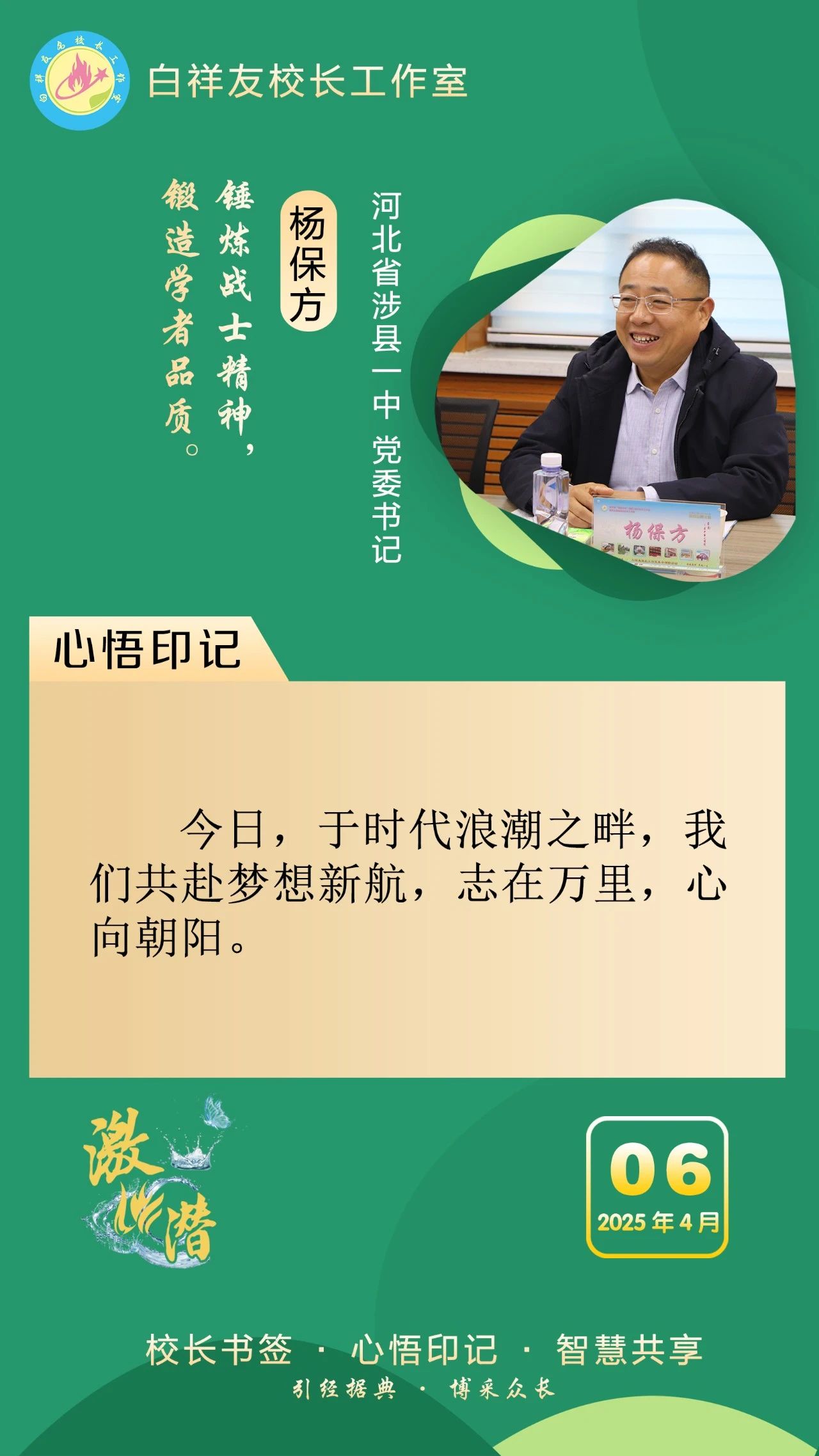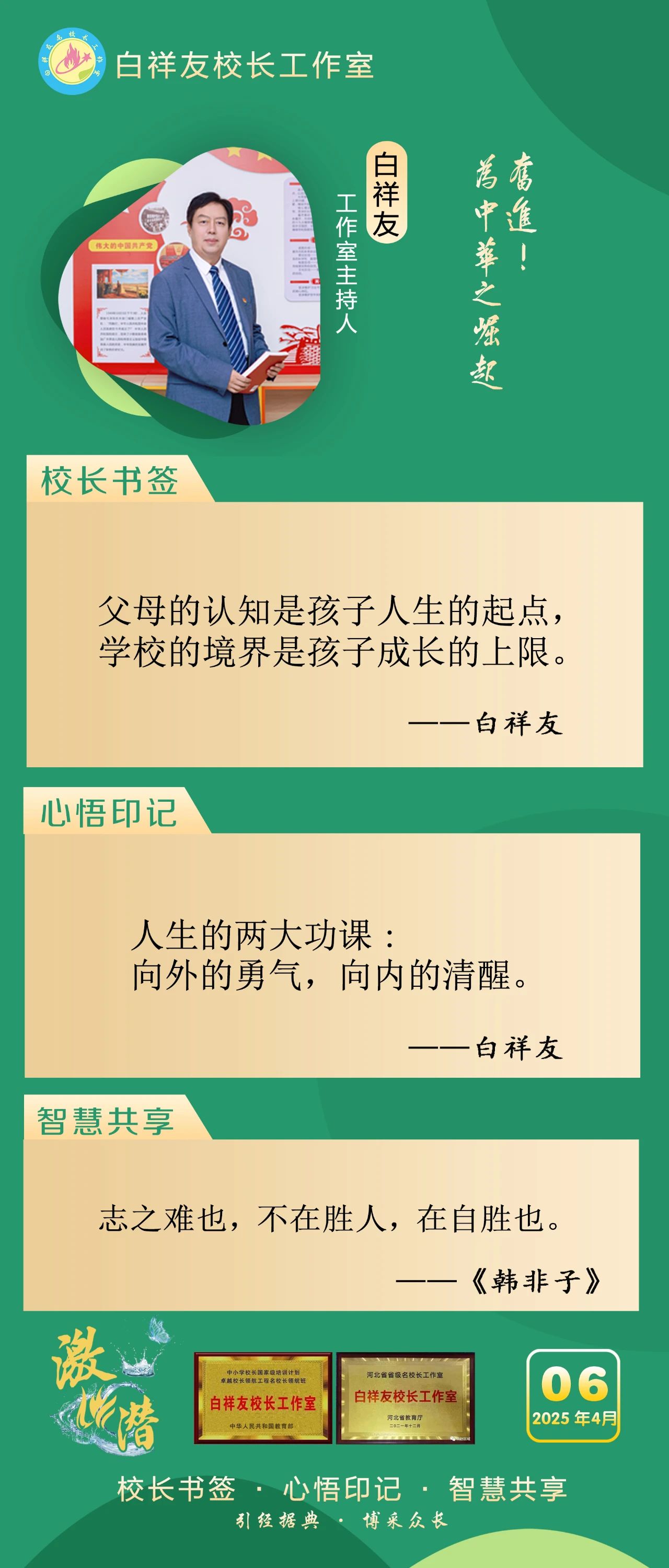 “白祥友校长工作室”成立于2019年4月,是教育部“国培计划”中小学名校长领航工程、河北省首批名校长工作室,目前省内外成员校56个。工作室坚持“资源共享、智慧共融、互助共赢”理念,已成为思想碰撞的交流场,资源共享的品牌站,成果展示的辐射源。