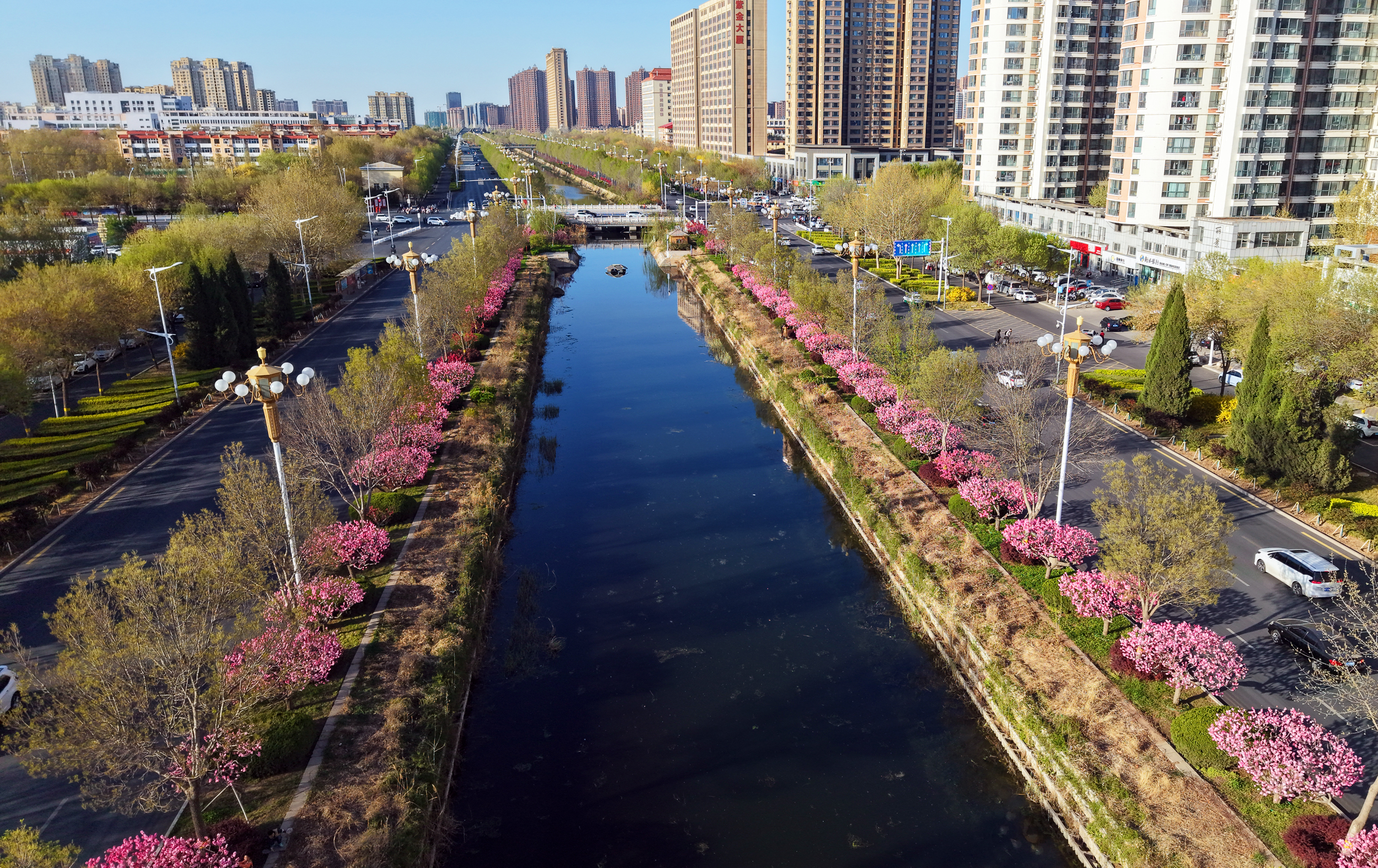 站在前进大街的天桥上,视野开阔。一排排郁郁葱葱的白蜡树,与色彩明艳的碧桃花交相辉映,构成了一幅生机盎然的春日图景。碧桃花挤满枝头,一簇簇、一朵朵娇艳欲滴。红的热烈似火,粉的柔美似霞,每一朵姿态各异,散发着独特魅力,让人应接不暇。