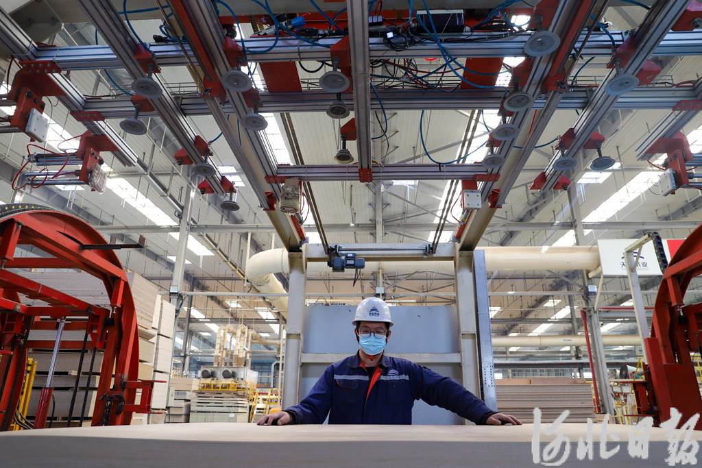 4月3日,在位于唐山市曹妃甸区的金隅天坛(唐山)木业科技有限公司生产车间,工人正在检查产品质量。王欣玥摄