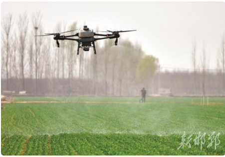 近日,在曲周县王庄村曲周“绿色吨半粮”万亩示范基地,科技小院的学生用无人机进行田间管理。