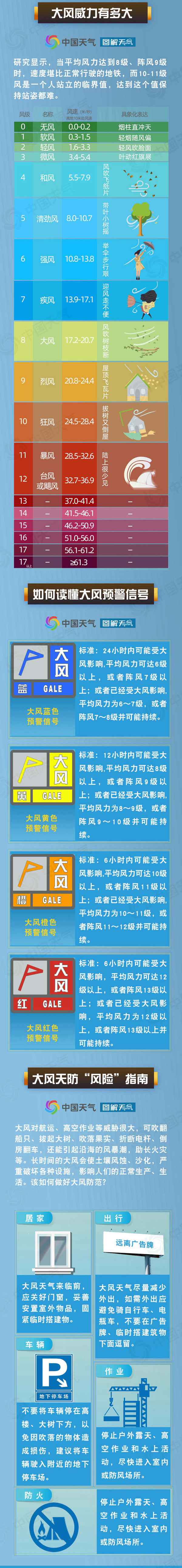 气象部门提醒:大风预计从11日傍晚开始,市民非必要不外出,关闭门窗,收好阳台外的临时物品;停止露天活动和高空等户外危险作业,危险地带人员和危房居民尽量转到避风场所避风;相关水域水上作业和船舶采取积极的应对措施,加固港口设施,防止船舶走锚、搁浅和碰撞;切断户外危险电源,加固围板、棚架、广告牌等易被大风吹动的搭建物,妥善安置易受大风影响的室外物品,遮盖建筑物资;不要在高大建筑物、广告牌、临时搭建物或大树的下方停留。