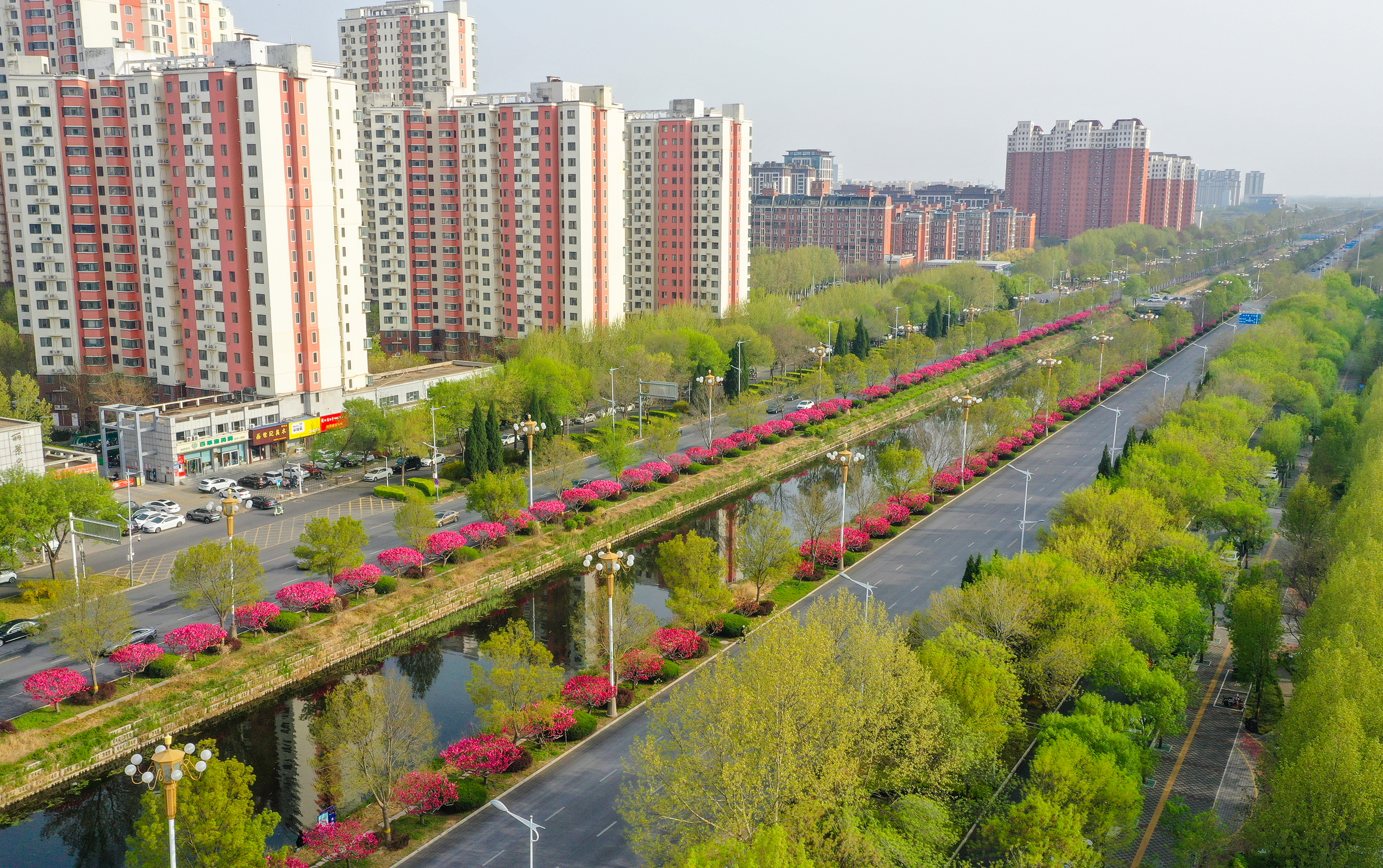 在市区的前进街,春日的美景宛如一幅绚丽画卷。街道两旁绿树枝叶在微风中轻轻摇曳,碧桃花恰到好处地点缀其中,为这抹绿色增添了几分俏皮与艳丽。前进街两旁的建筑在这花与树的烘托下,更显独特韵味,让人不禁沉醉在这充满生机与烟火气的春日街景之中。