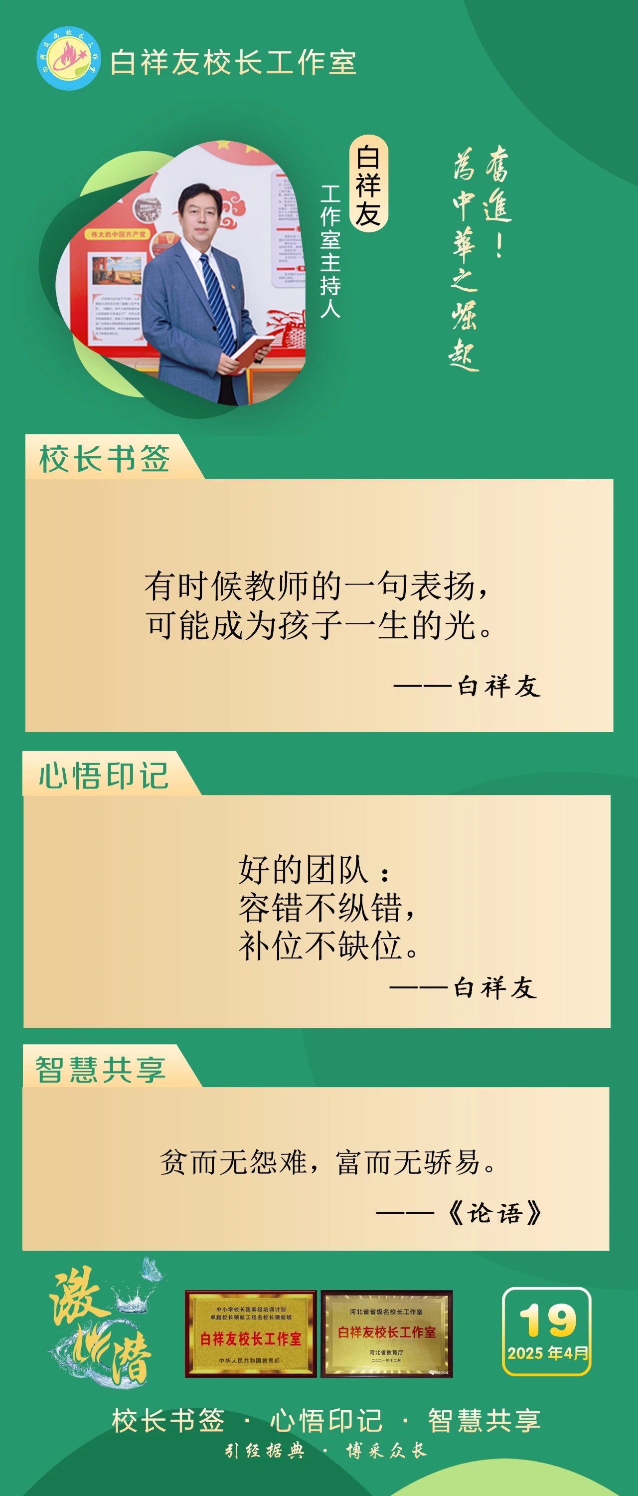 “白祥友校长工作室”成立于2019年4月,是教育部“国培计划”中小学名校长领航工程、河北省首批名校长工作室,目前省内外成员校56个。工作室坚持“资源共享、智慧共融、互助共赢”理念,已成为思想碰撞的交流场,资源共享的品牌站,成果展示的辐射源。