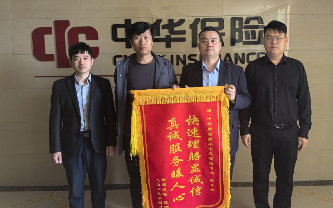 4月15日,衡水澍霖环保科技有限公司有关负责人刘某将一面印有“快速理赔显诚信,真诚服务暖人心”的锦旗送到中华财险衡水中支,对在员工意外身故后该公司迅速赔付40万元理赔款的暖心服务表达高度赞誉。