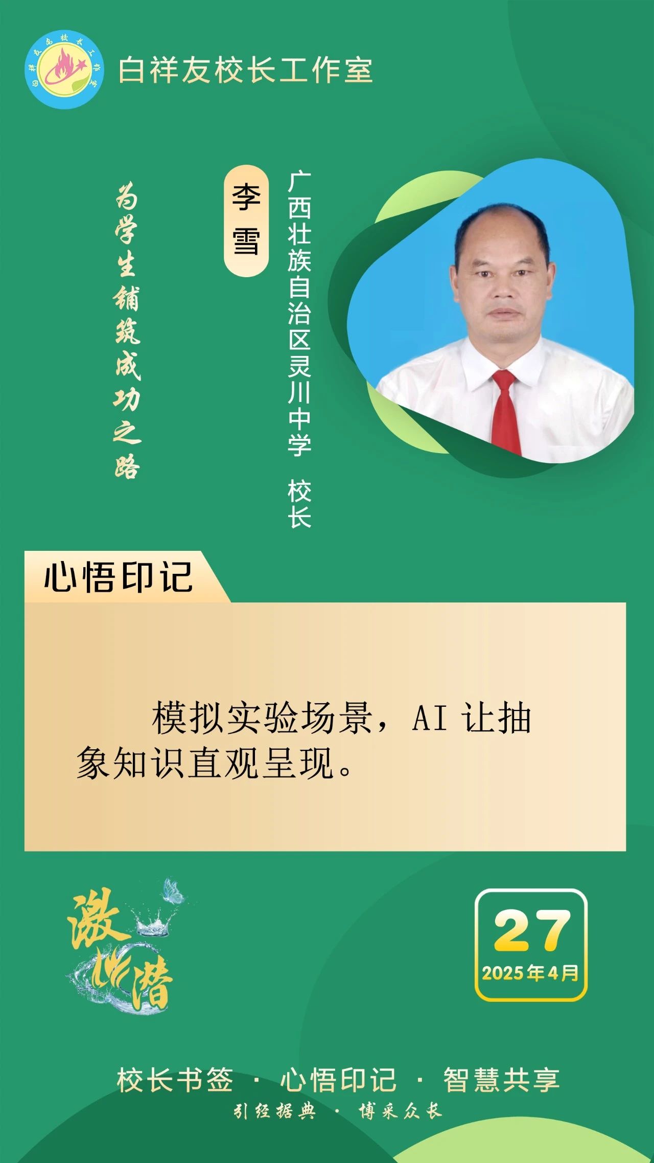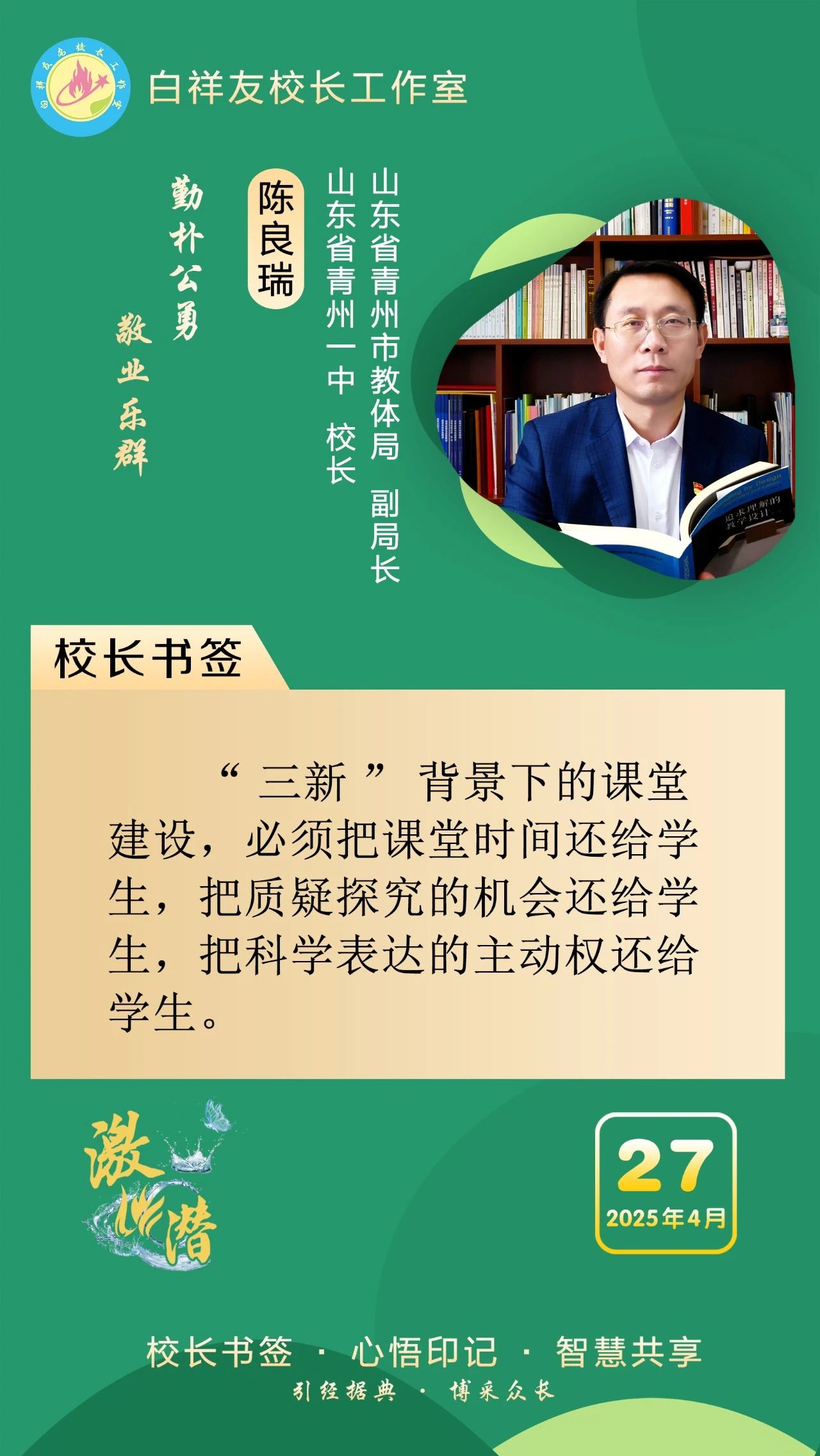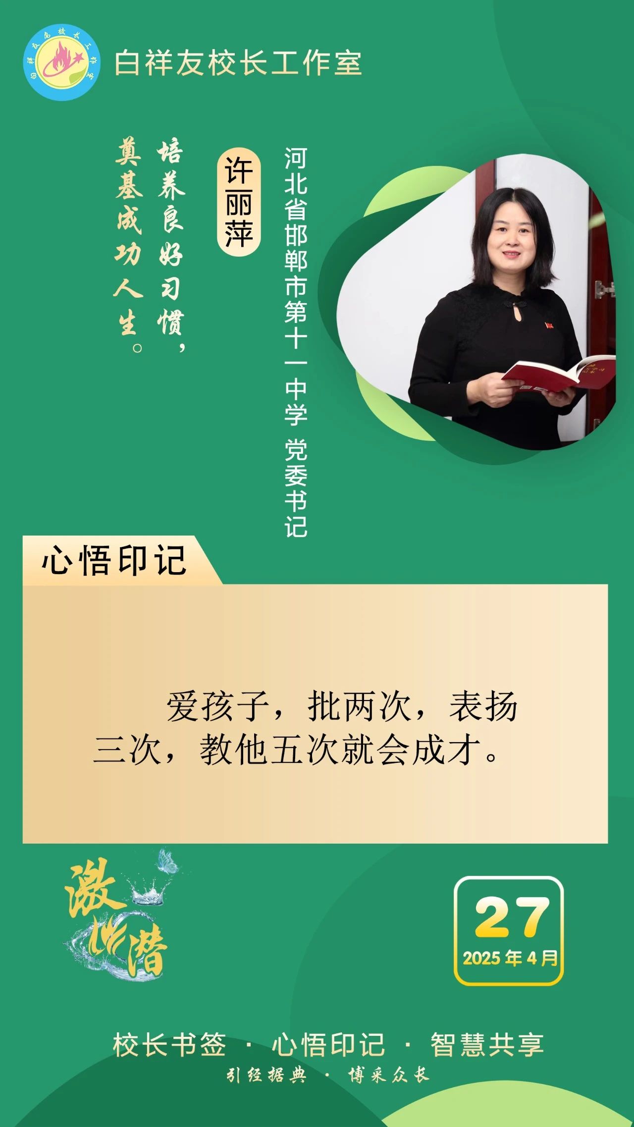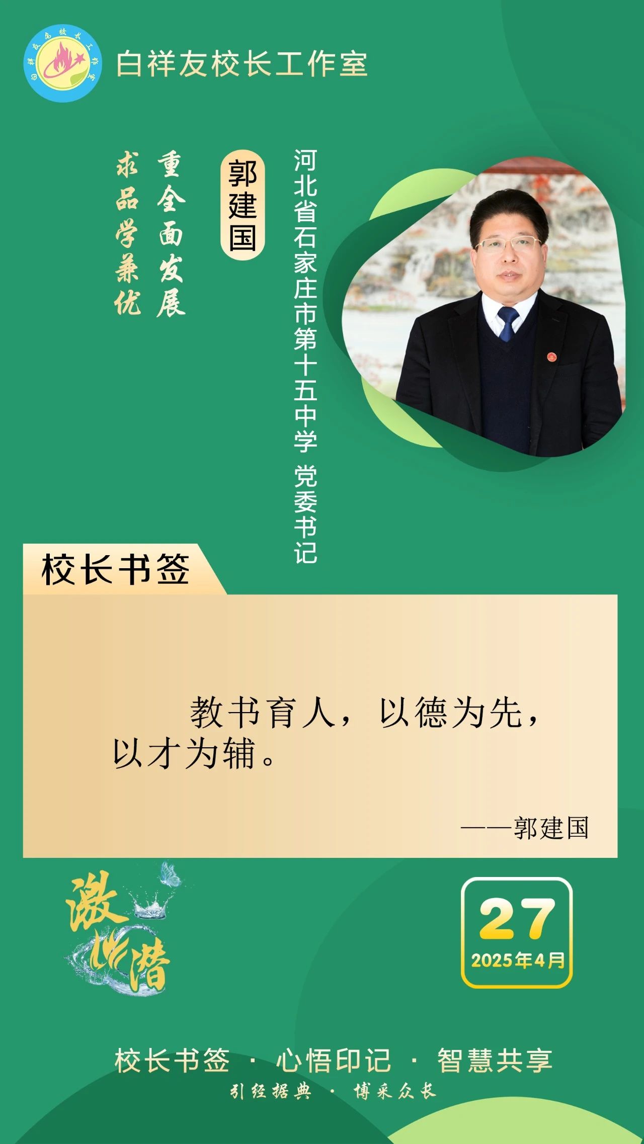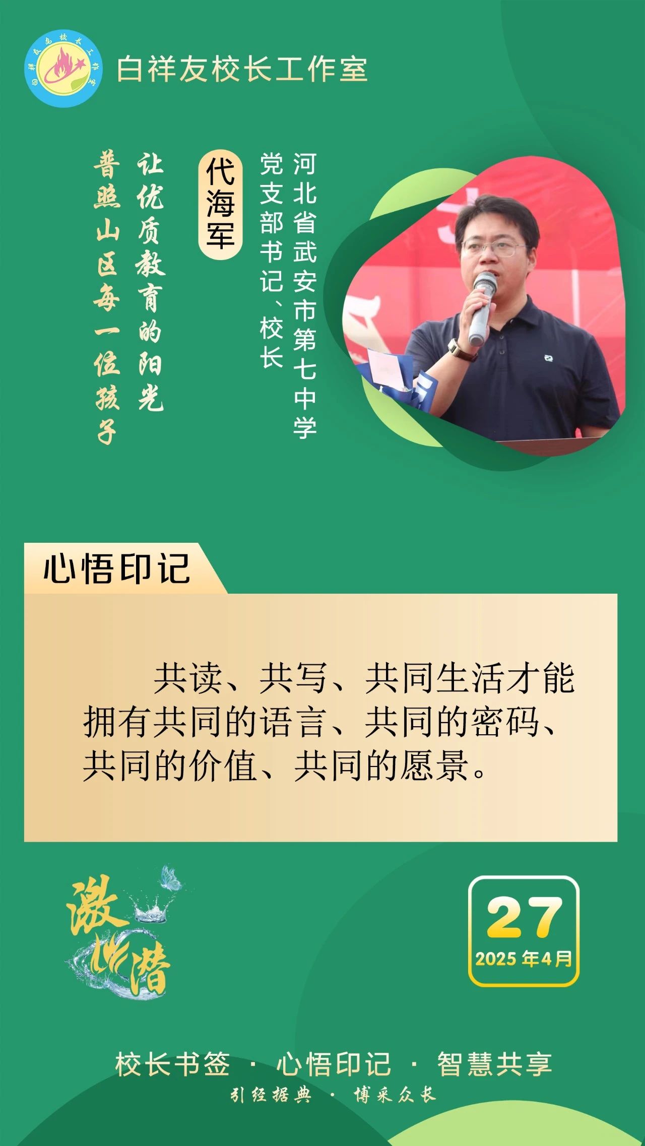 “白祥友校长工作室”成立于2019年4月,是教育部“国培计划”中小学名校长领航工程、河北省首批名校长工作室,目前省内外成员校59所。工作室坚持“资源共享、智慧共融、互助共赢”理念,已成为思想碰撞的交流场,资源共享的品牌站,成果展示的辐射源。