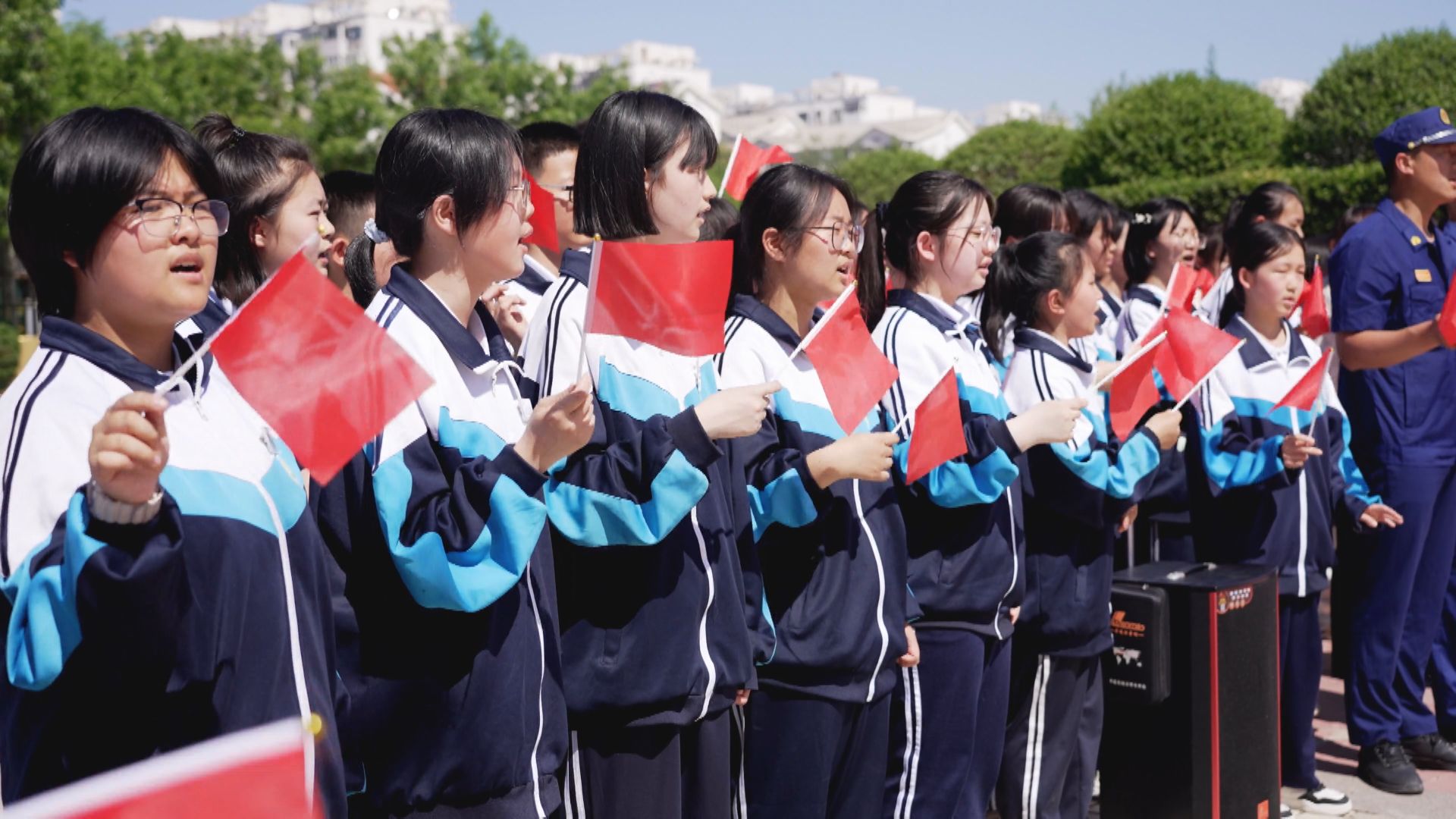 随着朗诵渐入高潮,激昂的旋律骤然响起。在巨幅五星红旗的背景下,六位不同年龄段的领唱队伍昂首挺立,成为全场瞩目的焦点,中年代表铿锵有力的声调、青年代表充满激情的呐喊,与少年清亮纯净的童声交织共鸣,瞬间点燃全场气氛。身姿如松的退伍老兵、守护平安的公安人员、仁心除病痛的医护人员、烈火逆行的消防人员、坚守道路安全的交通警察、匠心深耕岗位的省级劳动模范、青春朝气的新时代青少年……各单位代表队伍和现场群众,挥舞着手中的国旗汇聚,共同唱响《英雄赞歌》。他们用饱含深情的歌声,致敬那些为民族独立、国家富强而不懈奋斗的英雄先辈。