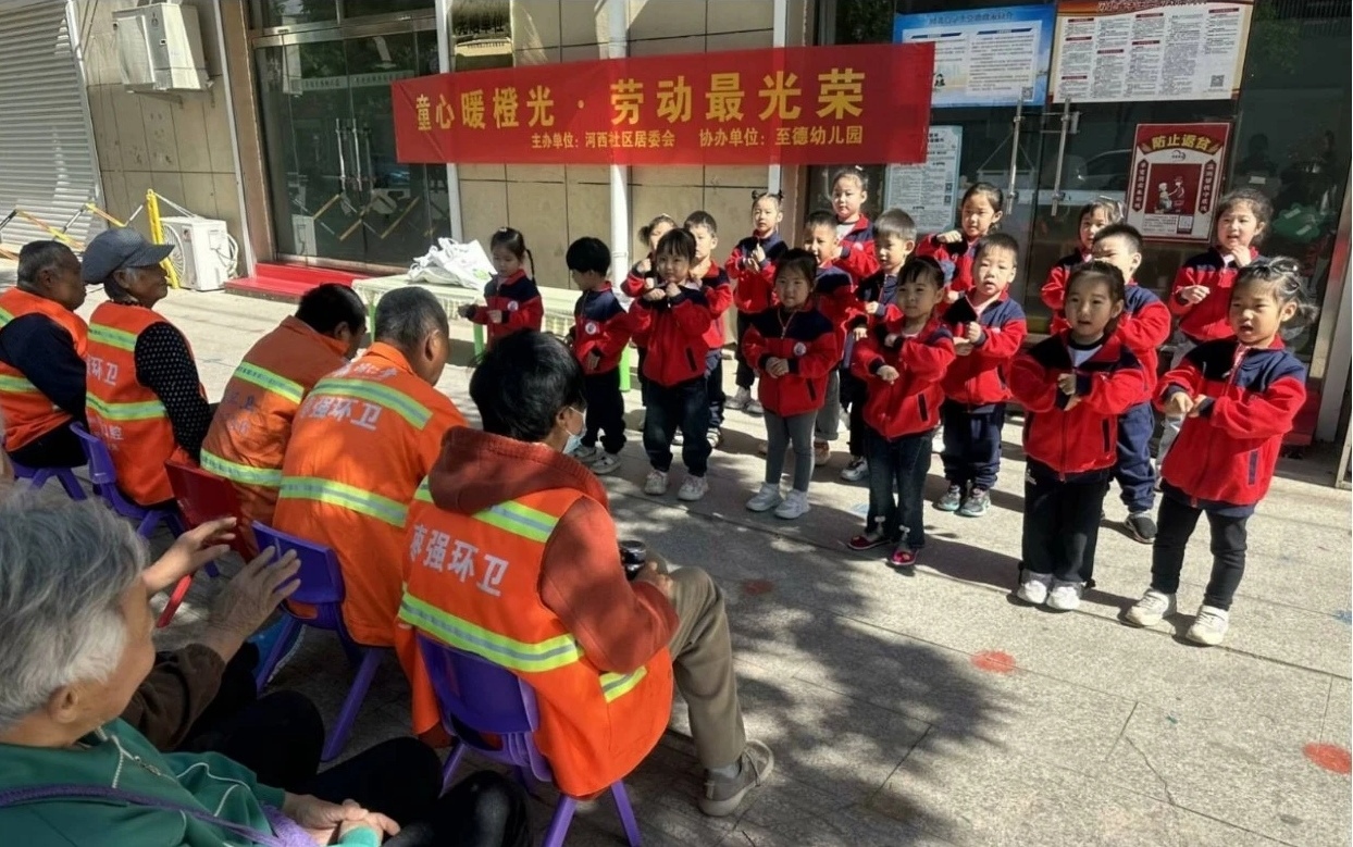 世纪社区联合世纪幼儿园共同开展了“大手牵小手 童心护家园”志愿服务活动。大小志愿者结对合作对小区进行了清扫,让参与者体会到了环保的重要性和劳动的成就感。河西社区举办了“童心暖橙光 劳动最光荣”主题活动。活动现场,幼儿园的小朋友们手捧自制贺卡和画作送到环卫工人手中:“叔叔阿姨辛苦了!这是我们画的画!”随后,孩子们表演了舞蹈,社区也为劳动者们精心准备了“橙光关爱礼包”。
