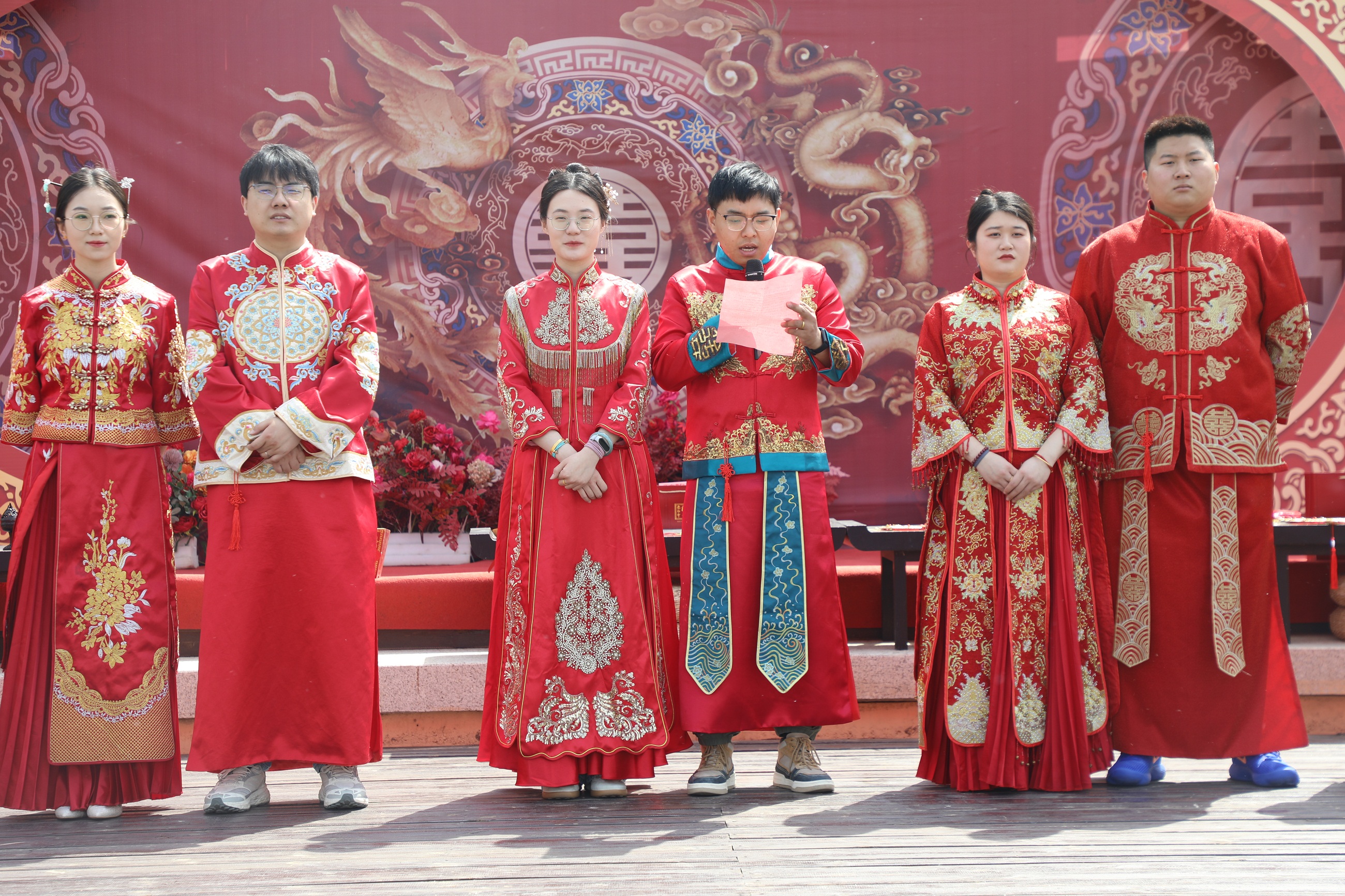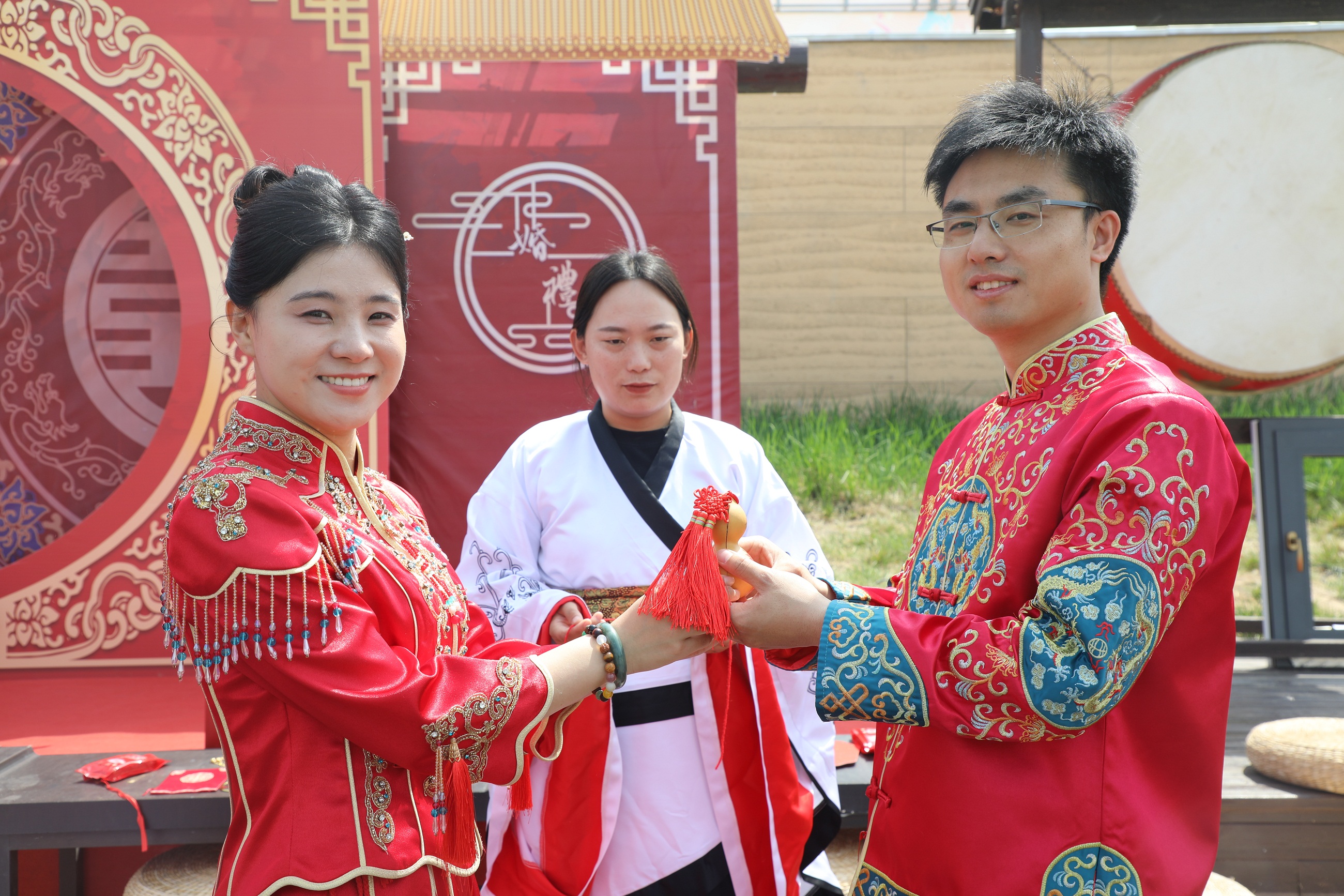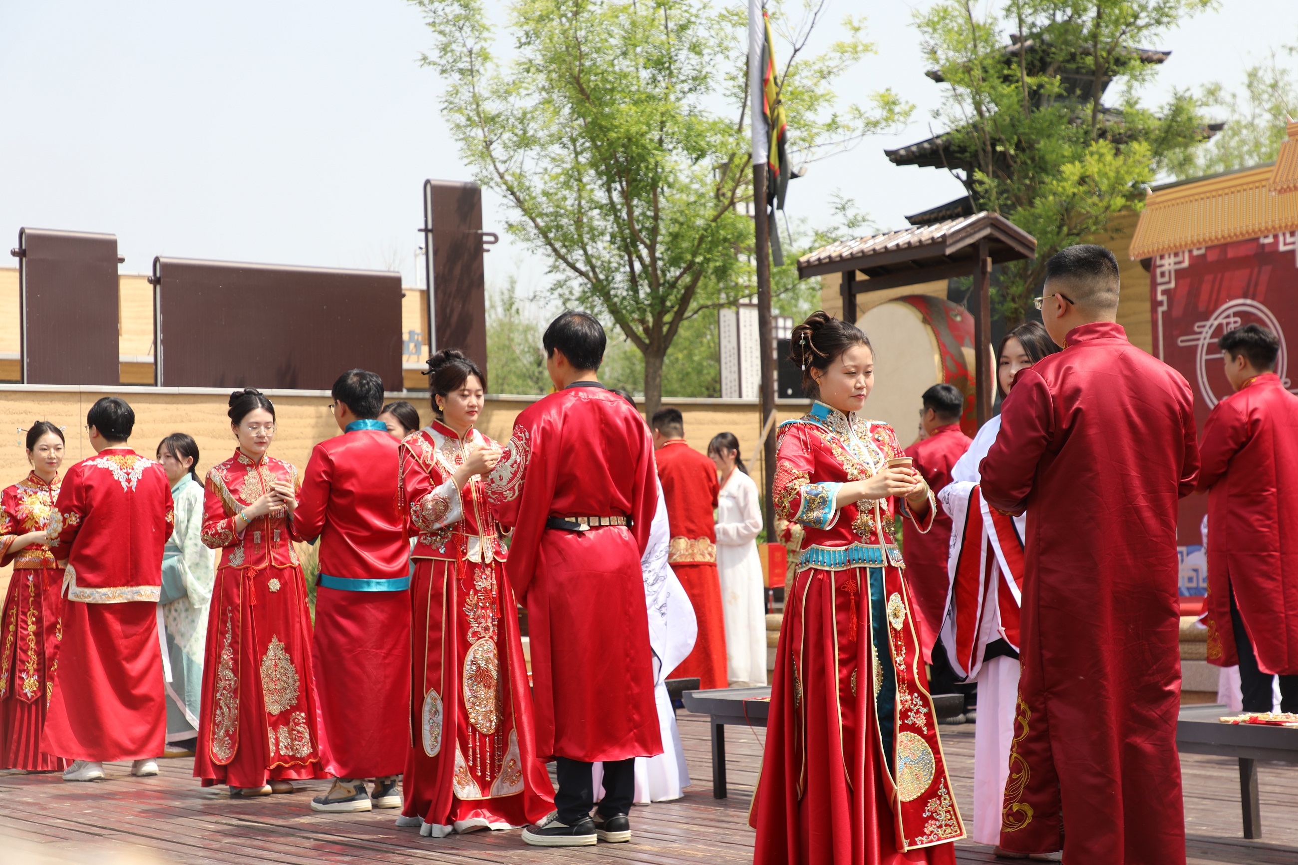 上午10 时 08分,吉时良辰。集体婚礼在悠扬的古乐声中拉开帷幕。10对新人身着华美汉服,在司仪的引导下依次行“沃盥礼”“合卺礼”“同牢礼”等传统礼仪。古城墙下,新人们的一举一动尽显华夏礼仪之美,千年文明与现代爱情在此刻交相辉映,尽显汉代婚礼风俗的典雅风范。