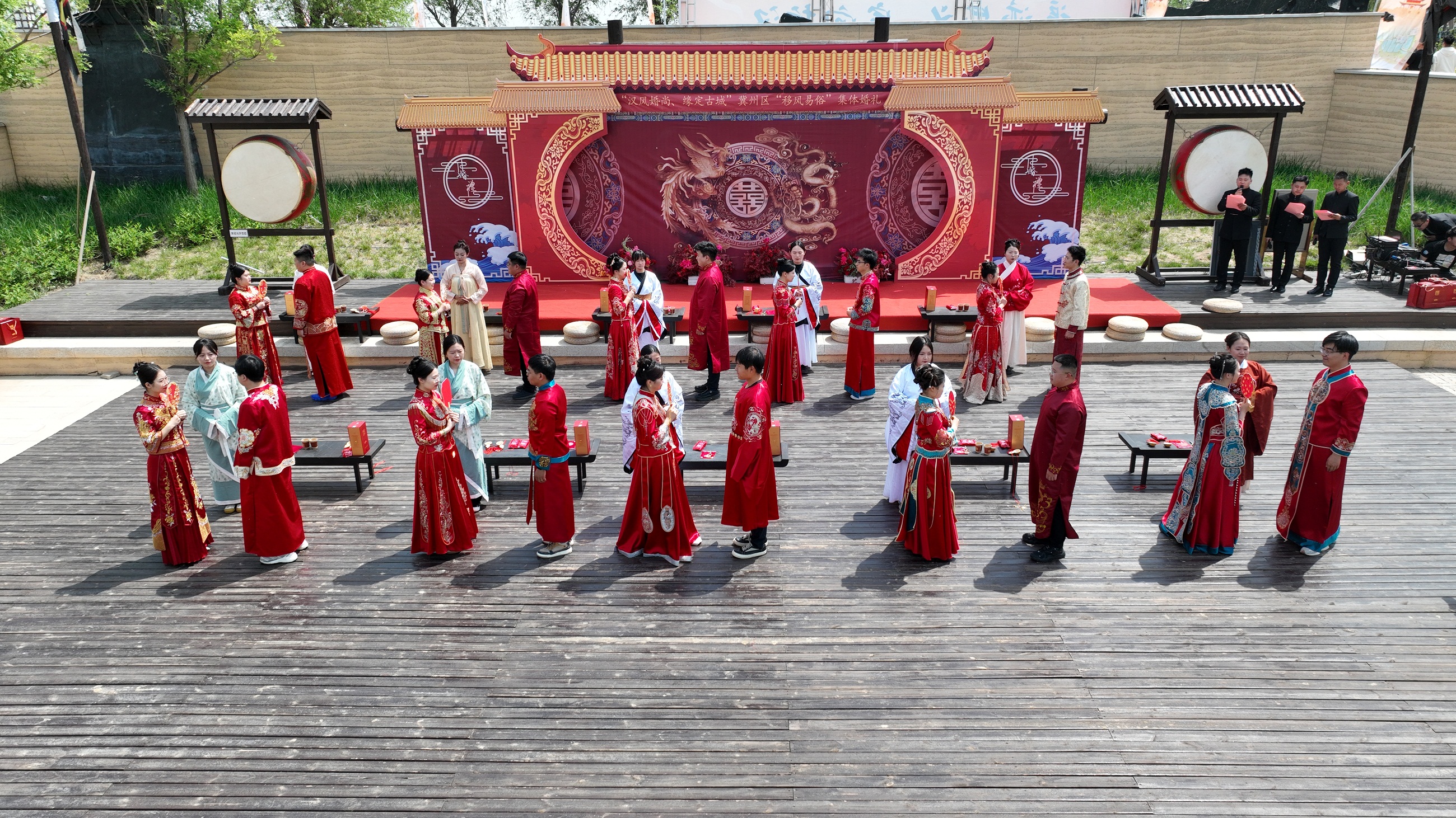5月2日,冀州区古城遗址公园内,红绸轻舞、古乐悠扬。一场别具特色的“汉风婚尚 缘定古城”集体婚礼在此浪漫举行。10对新人身着华美汉服,在千年古城遗址的见证下,以传统汉式婚礼喜结连理,用文明简约的方式演绎爱情誓言,践行移风易俗新风尚。