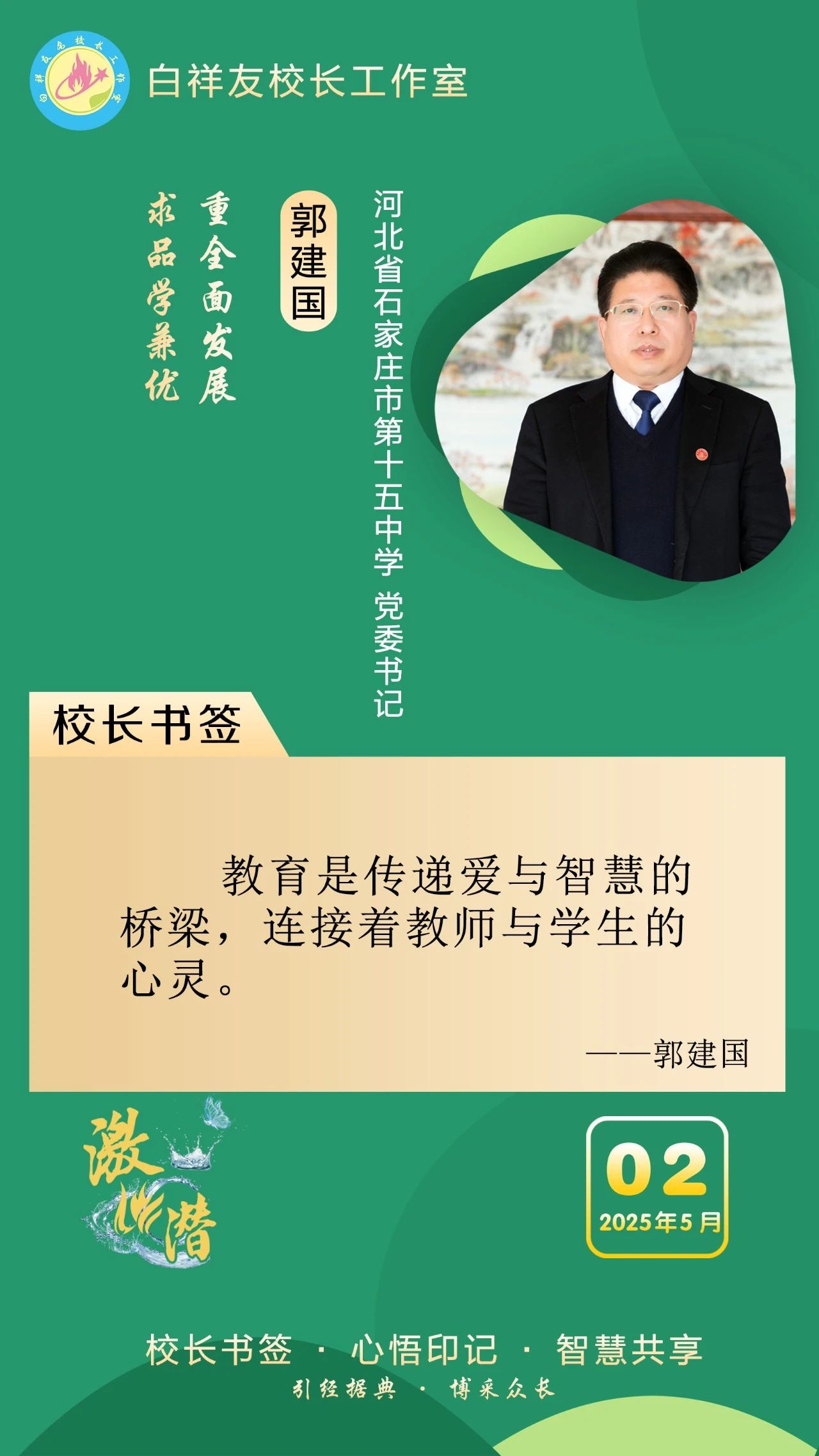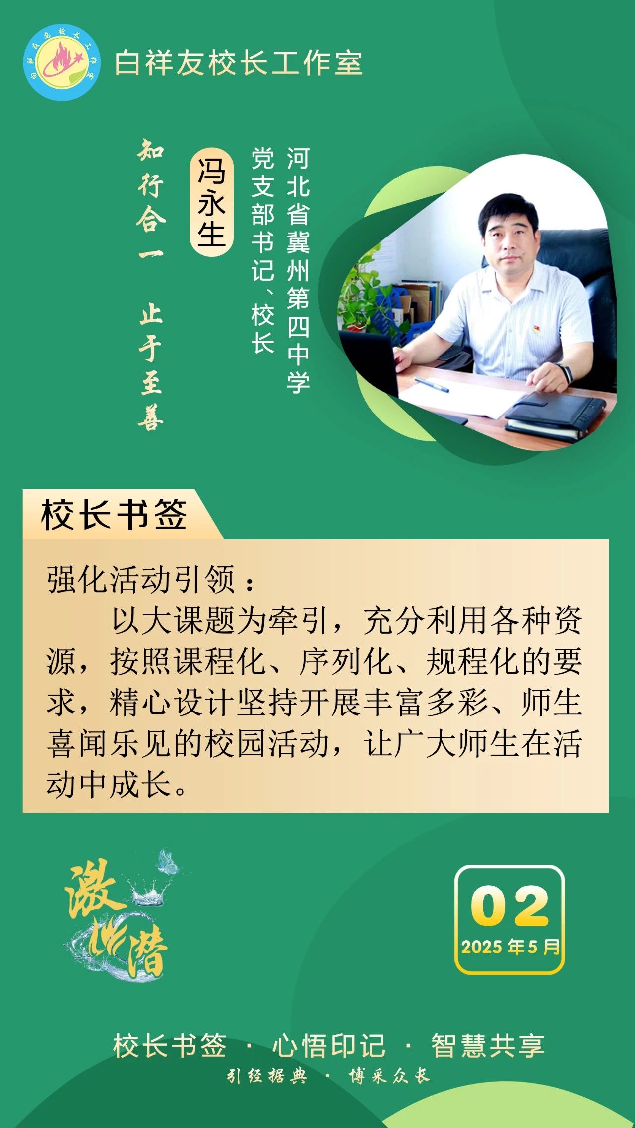 “白祥友校长工作室”成立于2019年4月,是教育部“国培计划”中小学名校长领航工程、河北省首批名校长工作室,目前省内外成员校59所。工作室坚持“资源共享、智慧共融、互助共赢”理念,已成为思想碰撞的交流场,资源共享的品牌站,成果展示的辐射源。