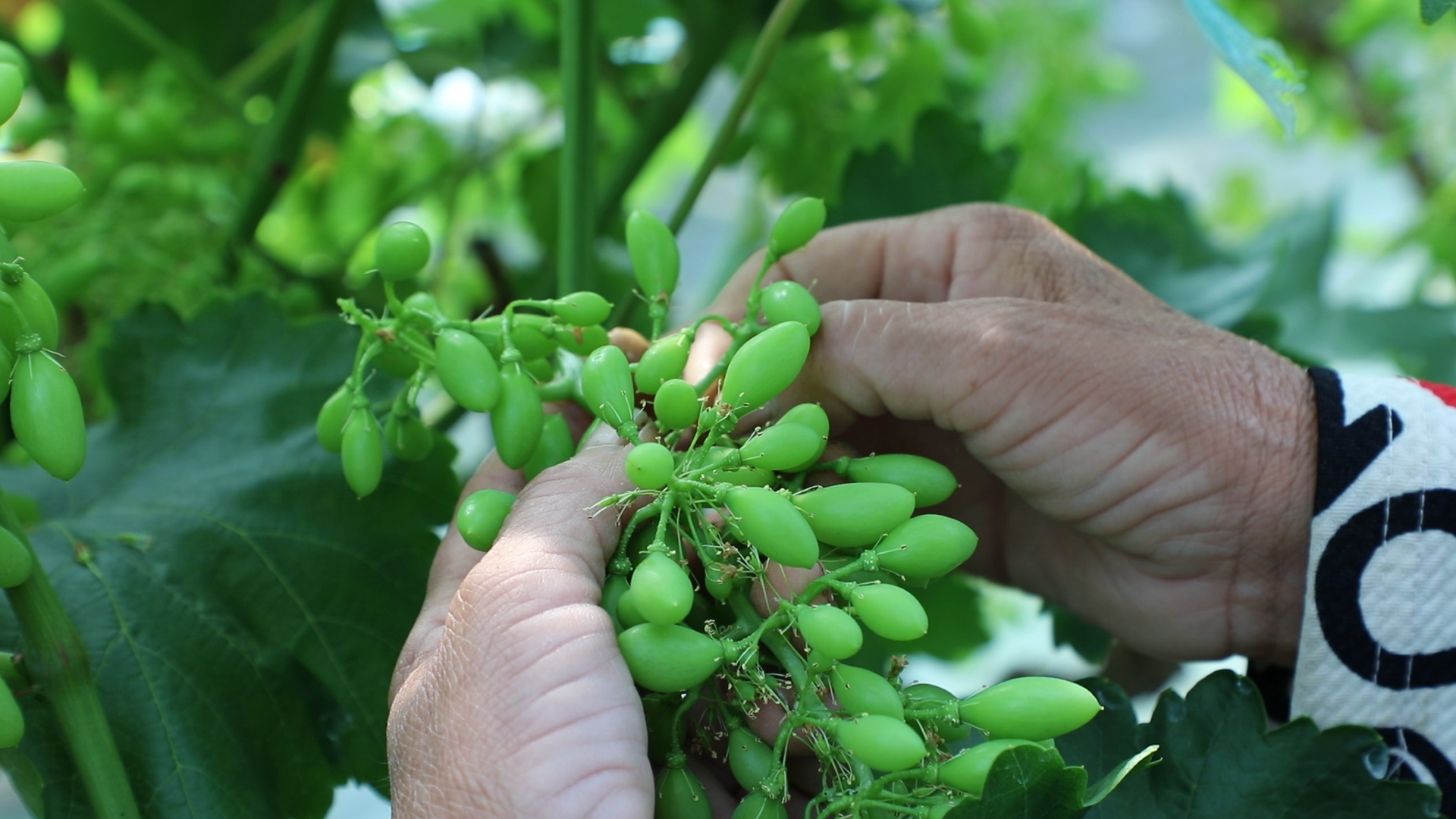 “疏粒是个细致活,你不能光图快,现在葡萄还没长成型,颗粒小,你必须要把每串葡萄都看到,把坏果、小果剔除掉,才能让葡萄更好生长。”果蔬工王妨说。