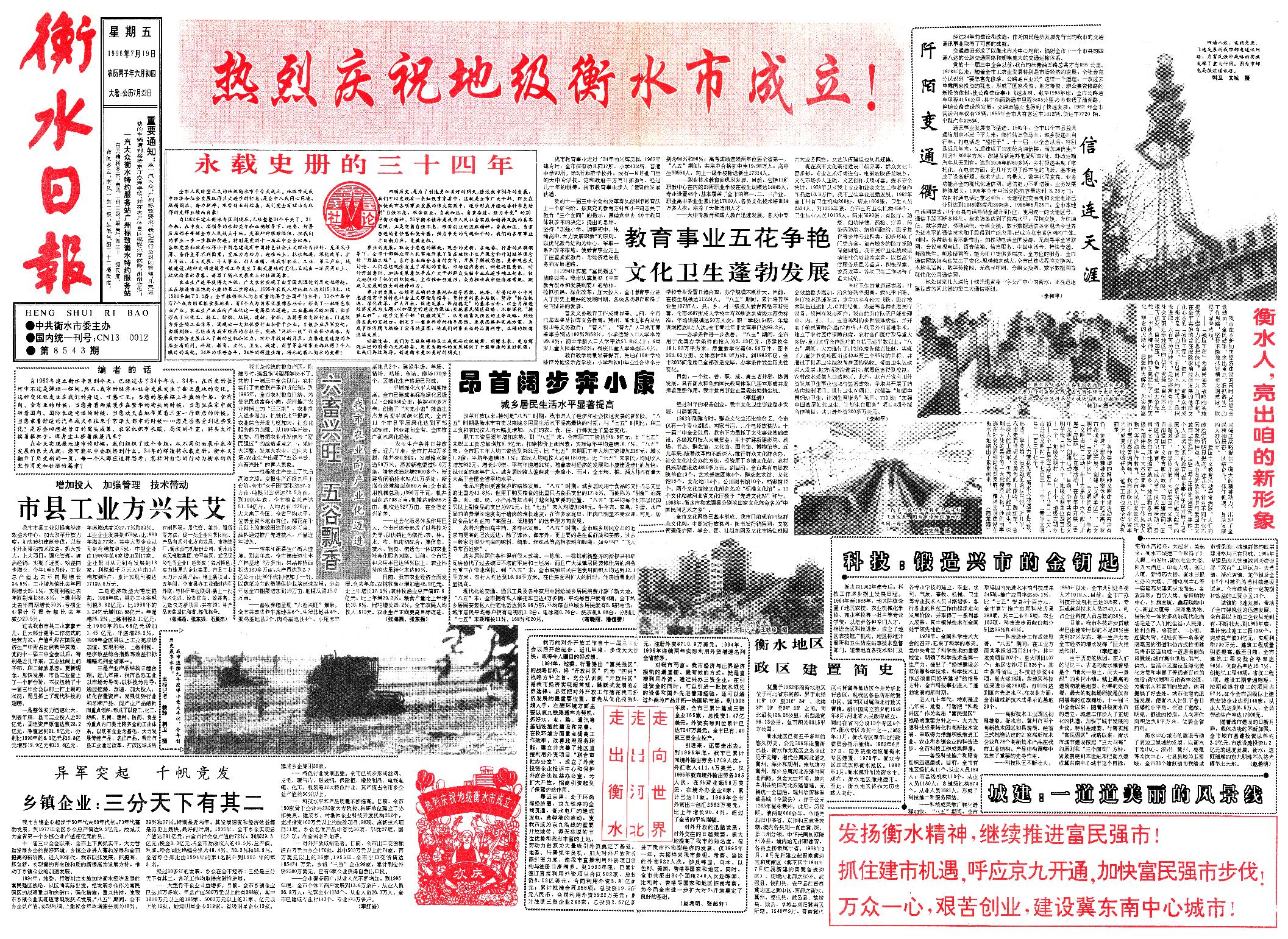 1996年7月19日,《衡水日报》头版转发省政府《关于撤销衡水地区设立地级衡水市的通知》,向广大市民报喜。从地区升级为地级市,意味着更多政策与资源要素将向衡水汇集。撤地建市,打响了这座小城崛起的“发令枪”。