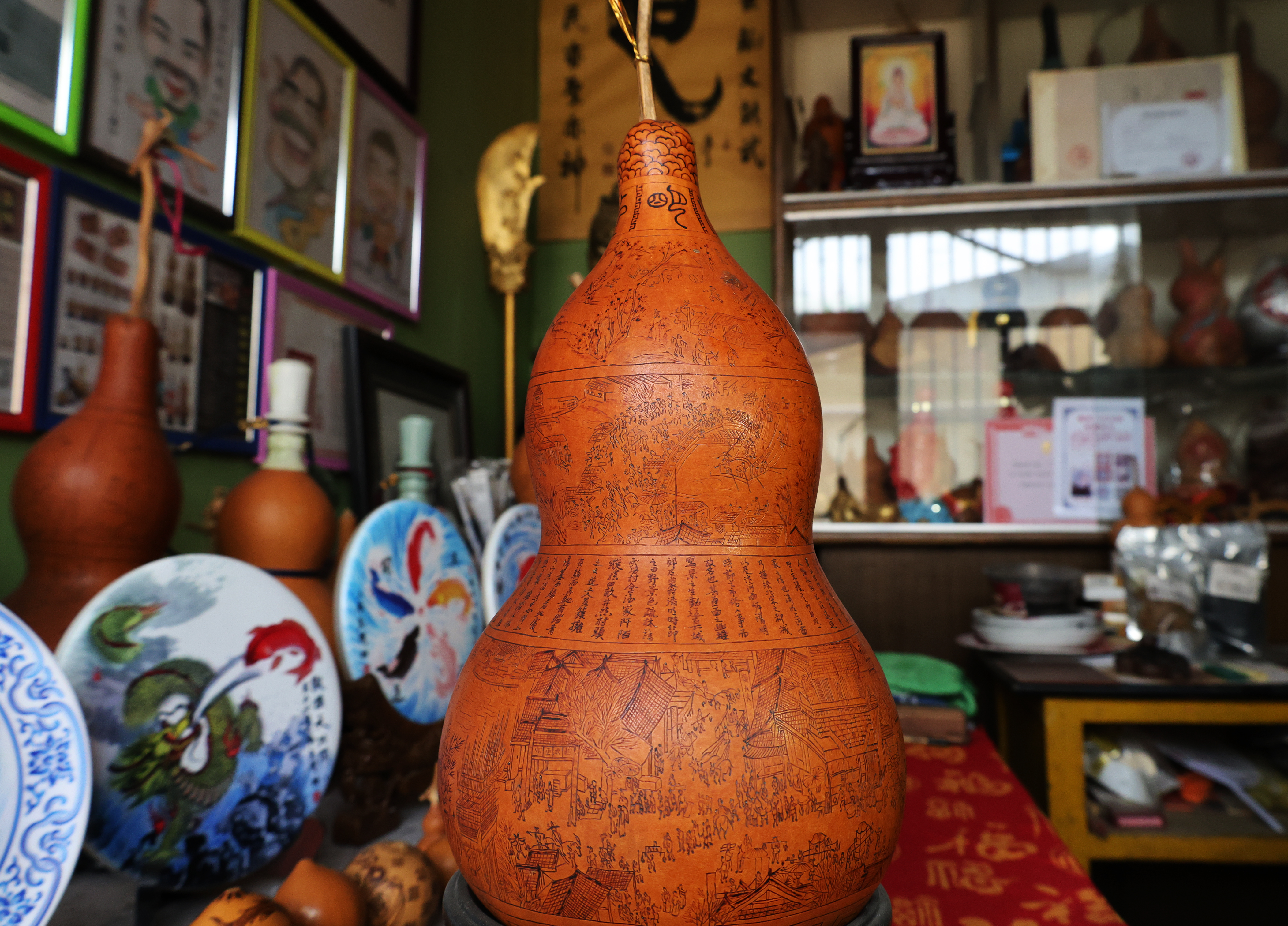 2002年,不甘于“小打小闹”的何胜旺做出了一个大胆决定——将《清明上河图》和《兰亭序》搬到葫芦上。这是一场与自己的较量,更是对传统技艺的致敬。在葫芦的曲面上还原这些鸿篇巨制,难度超乎想象。他反复研究比例、调整布局,尝试不同的烙画技法。三年时间,无数个日夜的打磨,当《清明上河图》葫芦烙画完成时,汴河两岸的市井繁华、虹桥上下的往来船只、酒肆茶坊的喧闹人群,都在方寸之间鲜活起来。2011年,何胜旺的《清明上河图》和《兰亭序》两件作品被收录进《冀州县志》,成为他艺术生涯的高光时刻。
