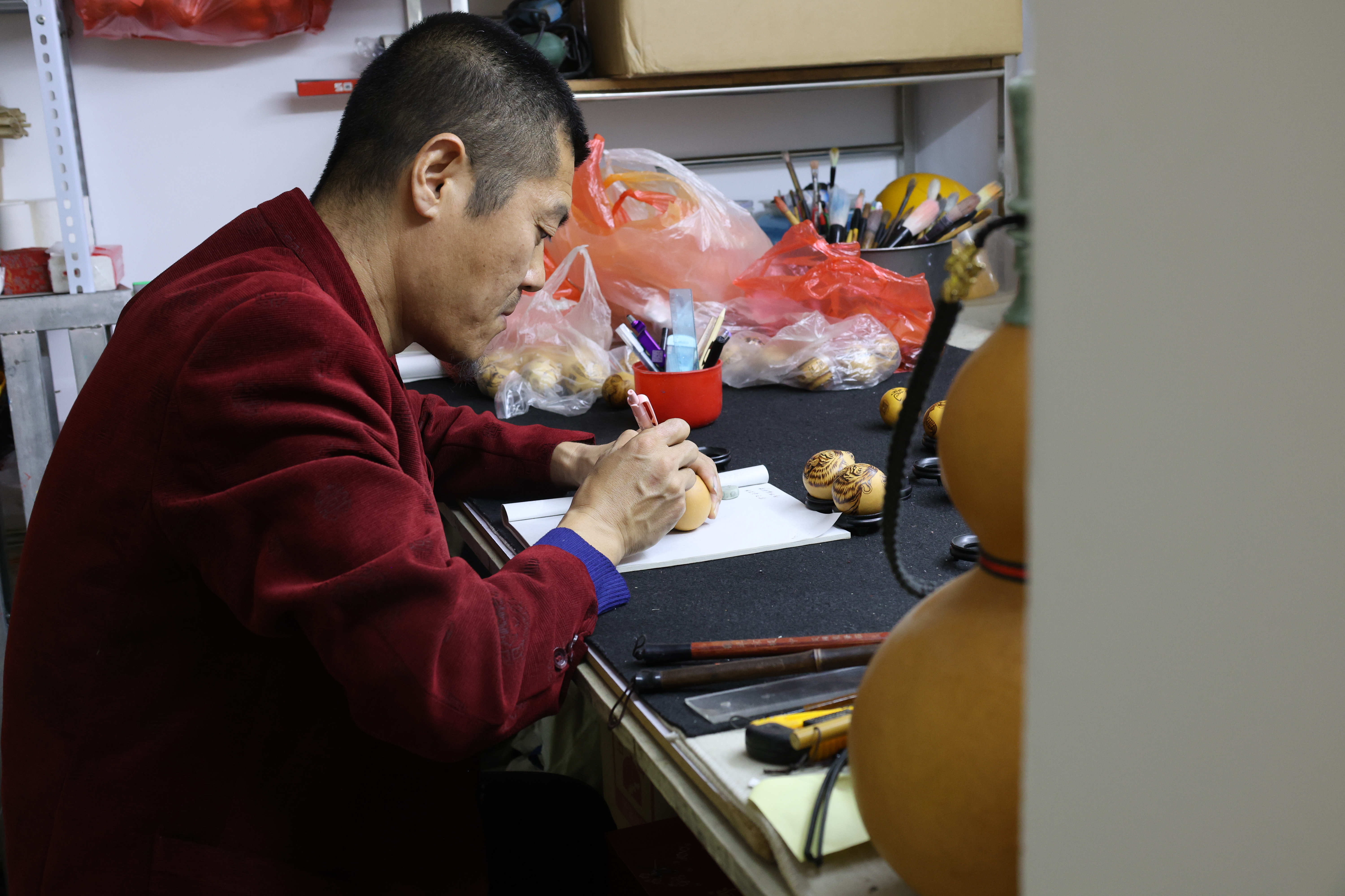 说起与烙画的缘分,何胜旺打开了“话匣子”,2000年的一个夜晚,央视播出的一档栏目里,艺人用铁笔在葫芦上作画的画面,深深触动了他,“用一把烙铁,就能在葫芦上留下永恒的美?”带着这份好奇,何胜旺辗转数百里,拜入保定农业大学刘清华老师门下学习。学艺的日子里,他的手指常被烙铁烫出水泡,深夜的台灯下,总铺着记录温度与线条关系的笔记本。“烙山水要用虚火,勾勒人物得一气呵成。”这些心得,最终化作他掌心的老茧与指尖的敏锐。一个多月的学习,在技艺突飞猛进的同时,何胜旺也深深爱上了这门古老的艺术。