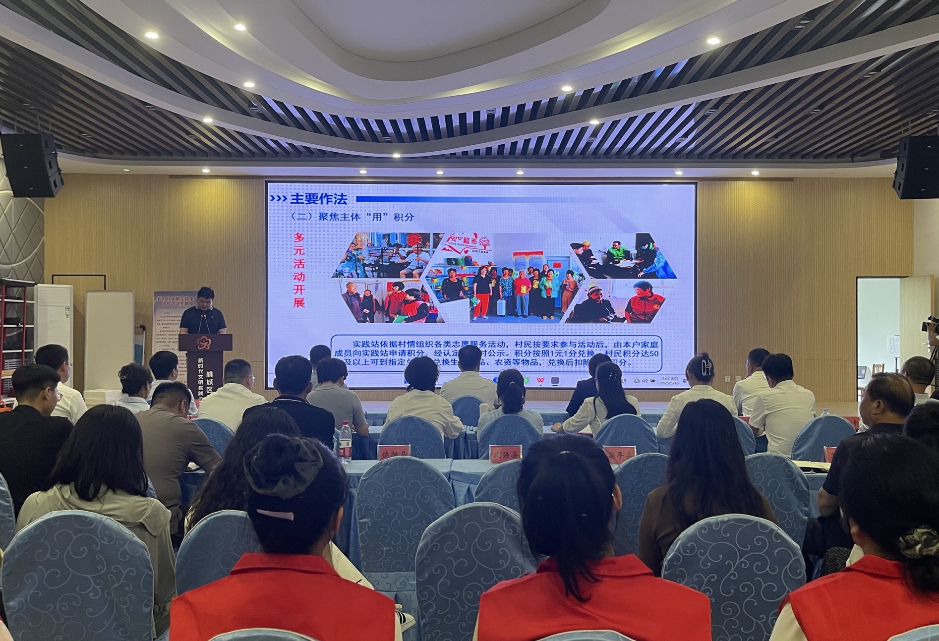 活动现场,各县市区的文明实践项目推介人通过PPT展示、短视频、故事讲述等形式,分别从立项动因、项目举措、项目成效、特色亮点等展开“比拼”,细致贴心的举措、生动感人的故事,振奋人心的效果,不时赢得了现场评委和观众的热烈掌声。参加此次擂台赛的文明实践项目涵盖理论宣讲、家风传承、助农惠农、文明风尚、移风易俗等多个领域。其中,桃城区创新推出的“文明家风润桃城”文明实践项目,通过打造家风家训线下阵地,培育家风建设骨干力量、组建家风实践矩阵等,形成“一户带一片、一片带全域”的辐射效应;枣强县从移风易俗入手,创新打造了“义工红娘”文明实践项目,充分发挥“红娘”桥梁纽带作用,以免费说媒为基础,宣传移风易俗,倡导婚事新办、简办等,营造出良好的社会风气;武强县创新推出的“爱心超市”项目,则以积分兑换为纽带,将群众参与志愿服务、环境卫生整治等各类文明实践活动与物质奖励挂钩,有效激发群众参与新时代文明实践互动的积极性,为基层治理注入新活力。