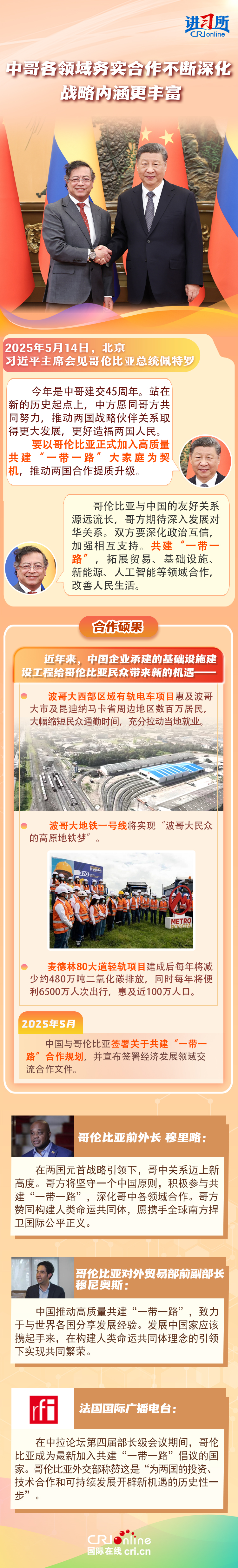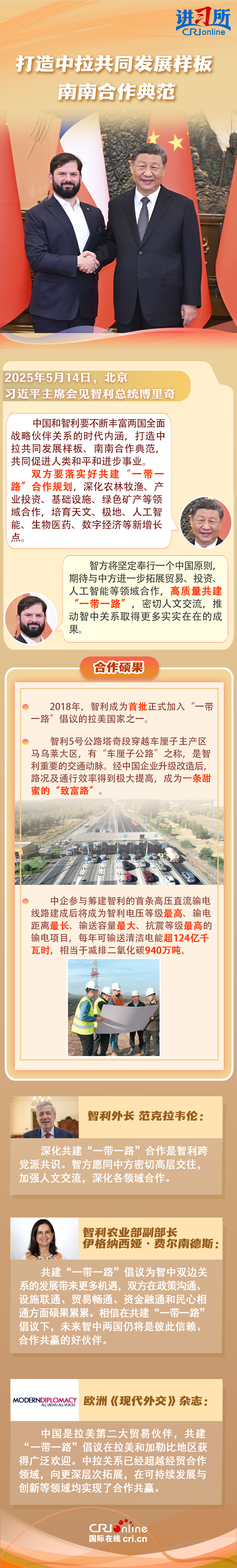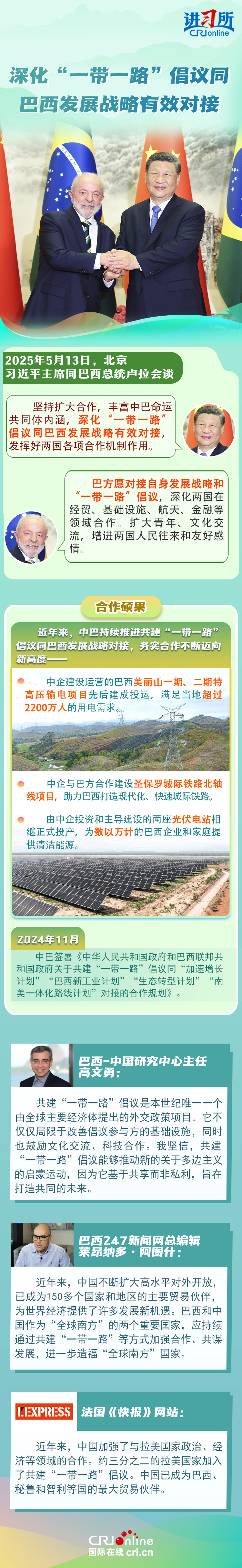 习近平主席在这三场双边外事活动中,均提到了共建“一带一路”倡议:“深化‘一带一路’倡议同巴西发展战略有效对接”“要以哥伦比亚正式加入高质量共建‘一带一路’大家庭为契机,推动两国合作提质升级”“双方要落实好共建‘一带一路’合作规划”……10多年来,在习近平主席亲自擘画和推动下,共建“一带一路”从中国倡议走向国际实践,取得了实打实、沉甸甸的成就。