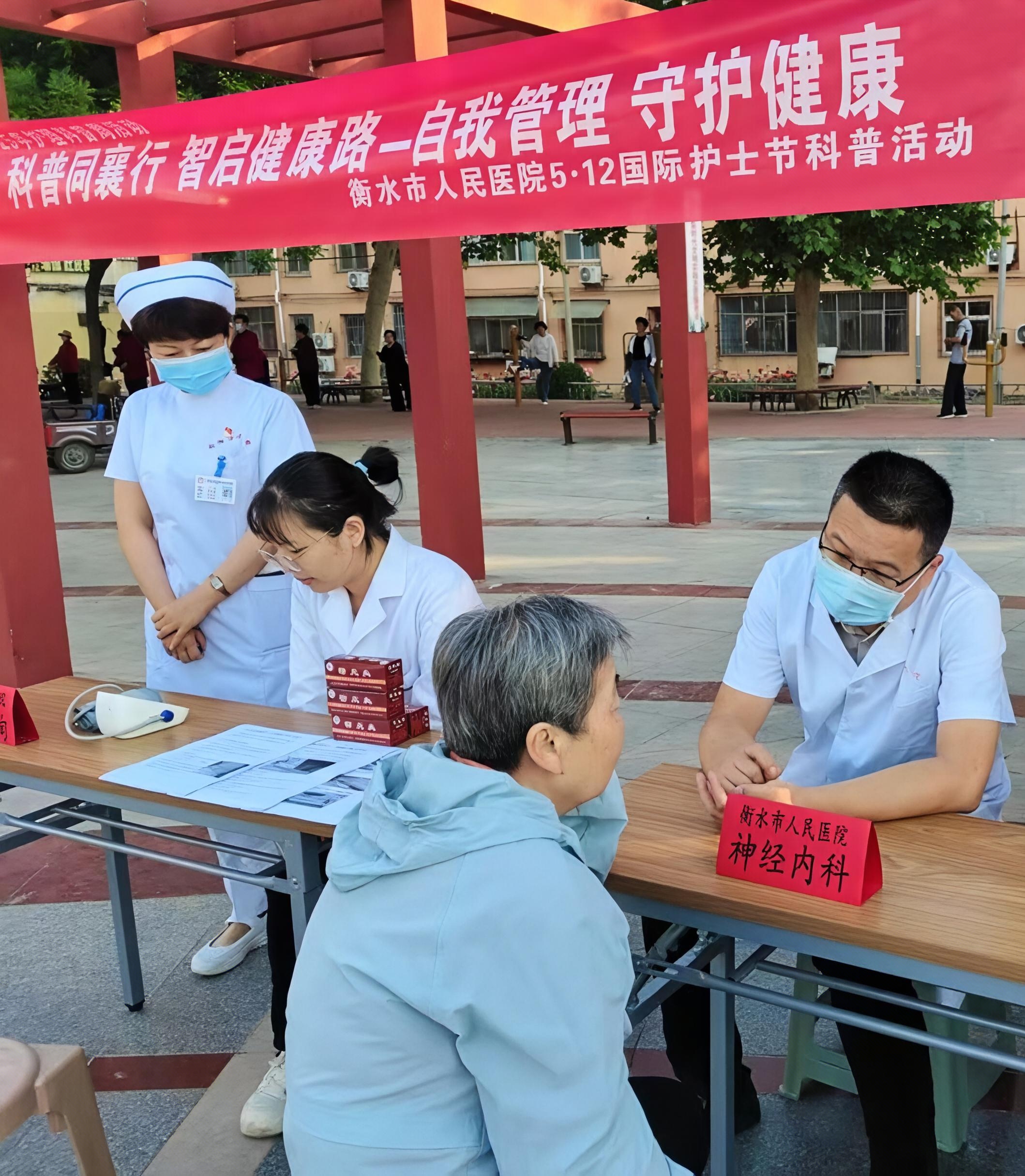 衡水市第六人民医院组织康复专业的资深医护工作者,助力全民健康素养。图为在为群众测量血压。