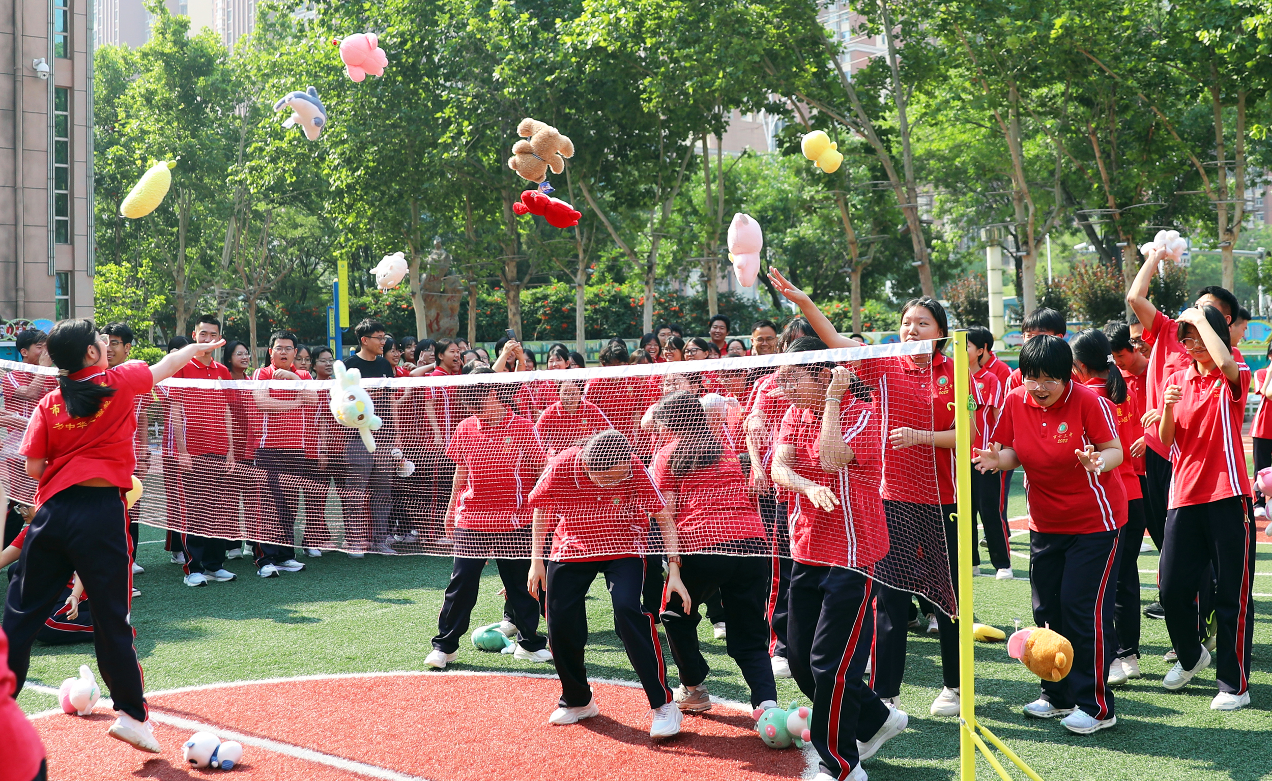 “夹球趣跑”将协作与竞速融合,14名学生相互挤住篮球,喊着统一口号同步冲刺。球体颠簸考验默契,有的队伍险些掉球,在队友调整下化险为夷;有的队伍稳健冲线,赢来欢呼。“玩偶投投乐”区域充满童趣,毛绒小熊、卡通抱枕等玩偶在空中飞舞,营造出轻松氛围,同学们尽情玩耍,笑声不断。高三22A11班的李默表示,游戏让他领悟到团结的力量:“就像高考,大家齐心协力,再难的关卡都能闯过去。同学们加油,高考必胜!”