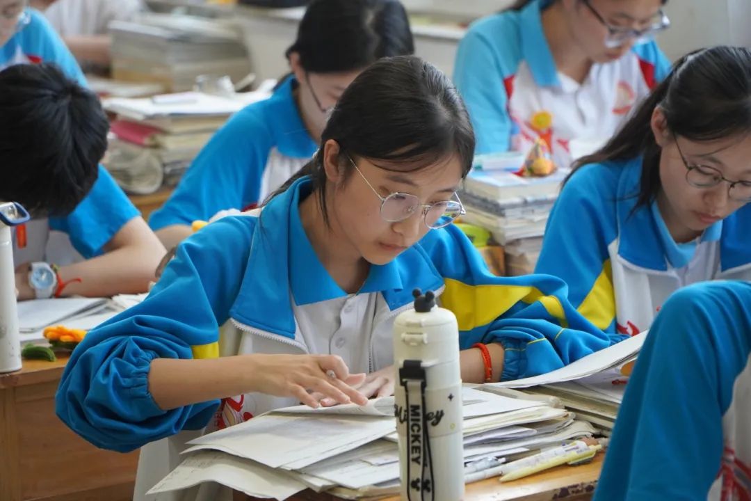 教室里,任课教师早已到达班级,并在黑板上布置好晨读任务。同学们稍作整理,便迅速投入激情满满的背诵中。他们全神贯注,声音响亮。晨光从窗户溜进教室为他们助威,照亮课本,也照亮他们眼中的炽热。