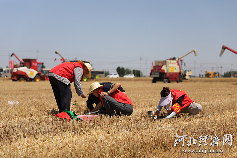 活动现场,工作人员在选定的采样区域捡拾掉落的麦粒。河北经济日报记者 李佳琦 摄