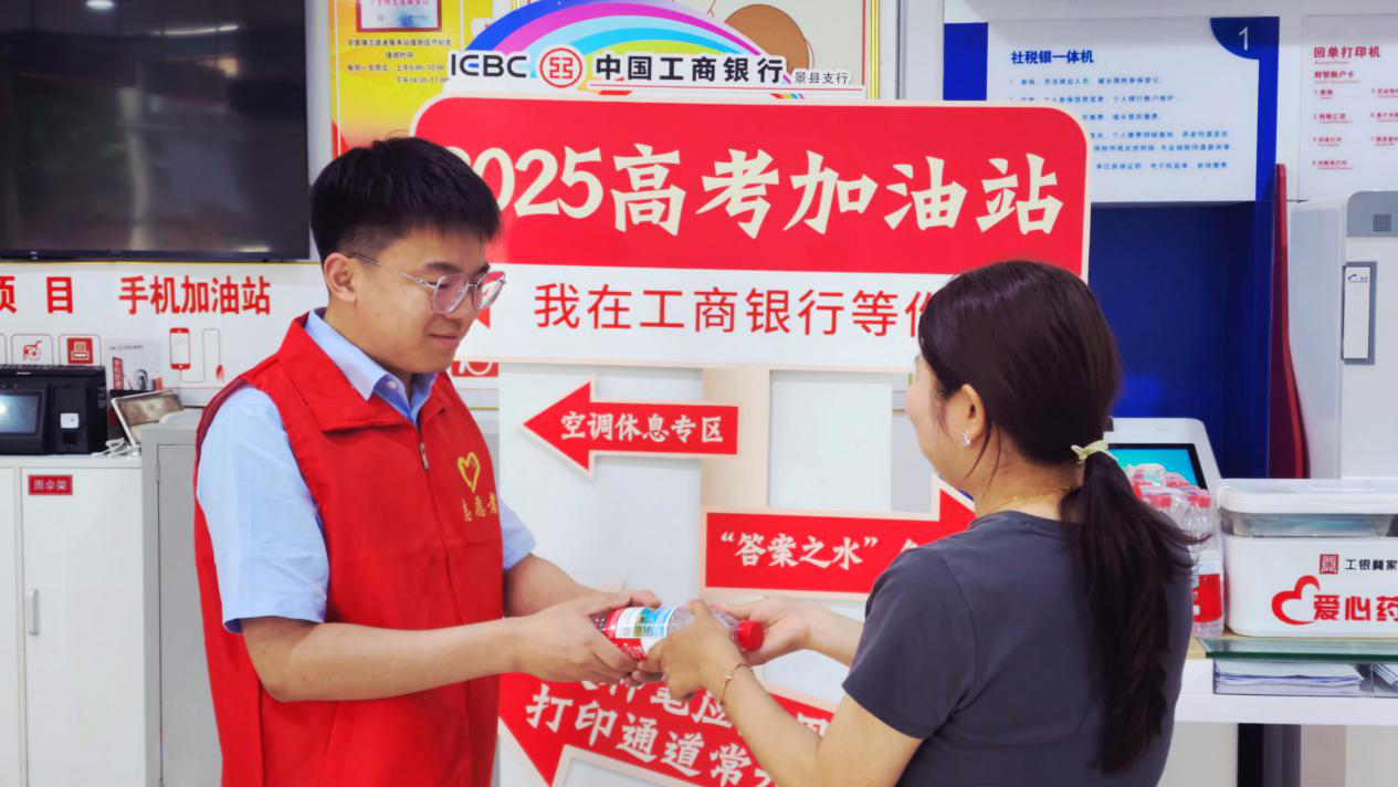 来自驿站的祝福。作为一位考生家长,刘梅在开考第一天就因为炎热和紧张感到中暑,她在爱人搀扶下走进不远处的工行景县支行营业室,大堂经理小马赶紧把刘梅扶到休息区坐下,把提前准备好的矿泉水拿给刘梅的爱人。刘梅缓和下后,认真打量了一下自己面前的高考爱心服务驿站,暖心的“2025高考加油站”和“我在工商银行等你”等字标映入眼帘。这时,大堂经理小马也再次来到刘梅身边询问情况,刘梅一边表示感谢一边指着驿站的“答案之水”的牌子说,不仅身体的不适缓解了,喝了水还对考场中的孩子充满信心。“母子连心,您有信心,孩子也会感应得到的,状态就能更好地发挥出来,笔下生辉、有梦必达!”小马的祝福让刘梅焦虑的心终于缓和下来,“是的,我相信自己的孩子。”