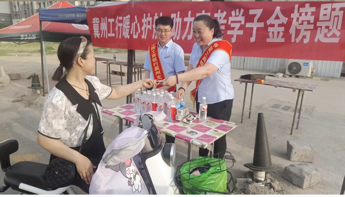 工行冀州支行服务团队的一名志愿者自己就是考生家长,她说一边服务一边守着孩子,更安心。